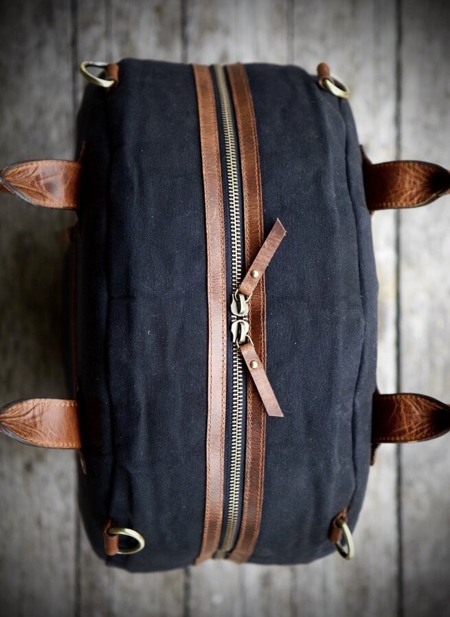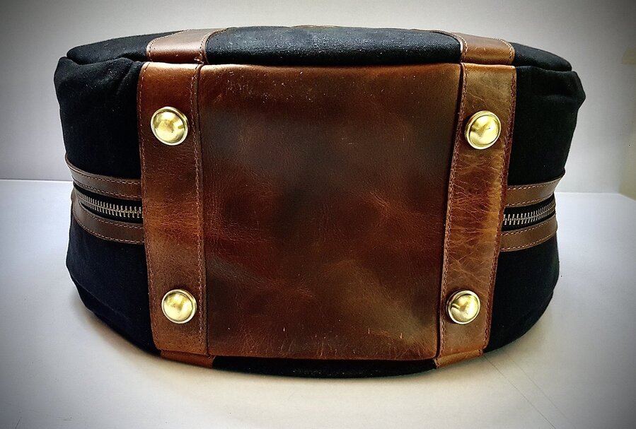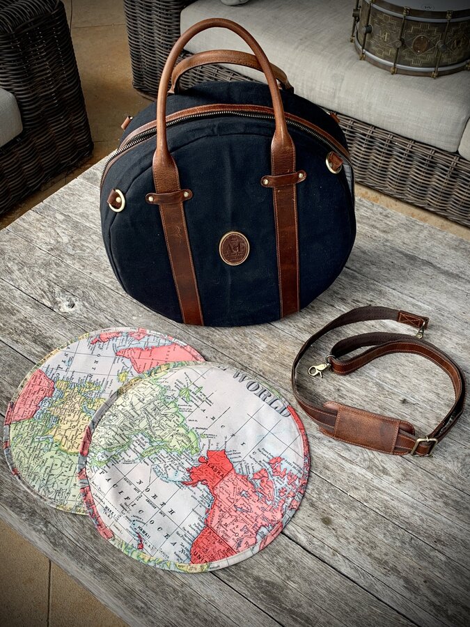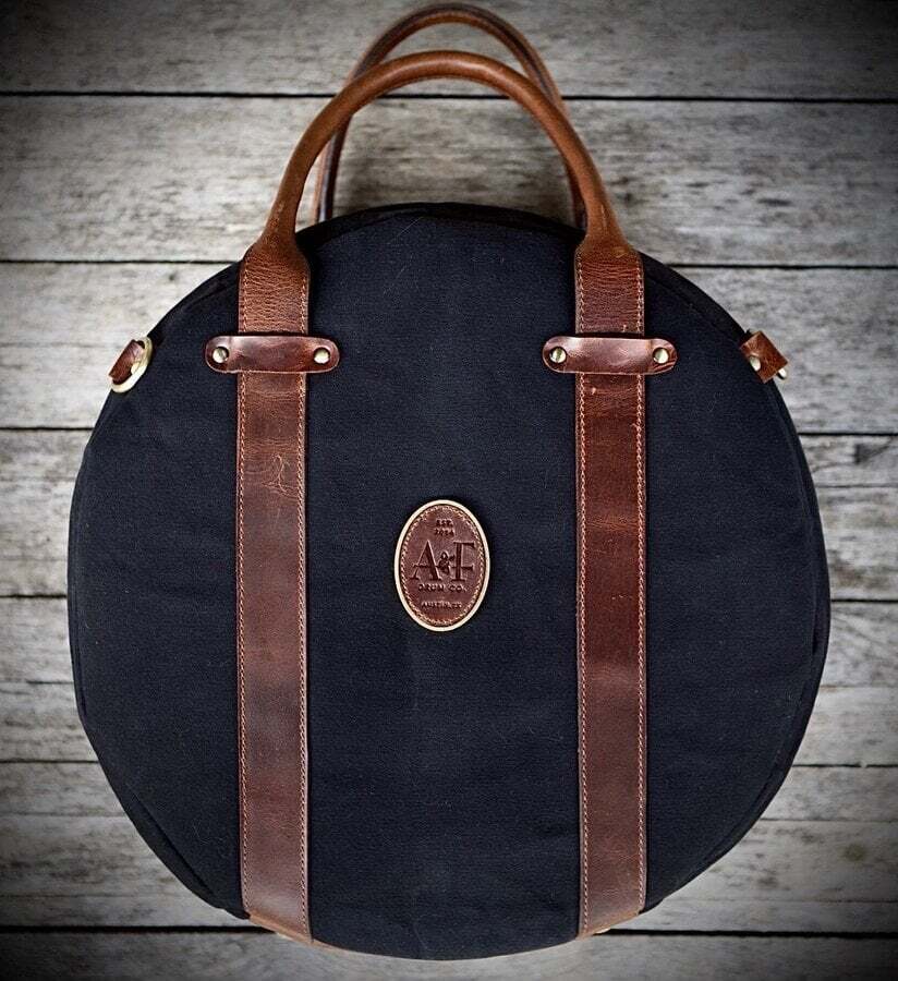 A 16oz. black waxed canvas and Italian leather snare bag that holds a drum up to 15” in diameter and 8” in-depth.