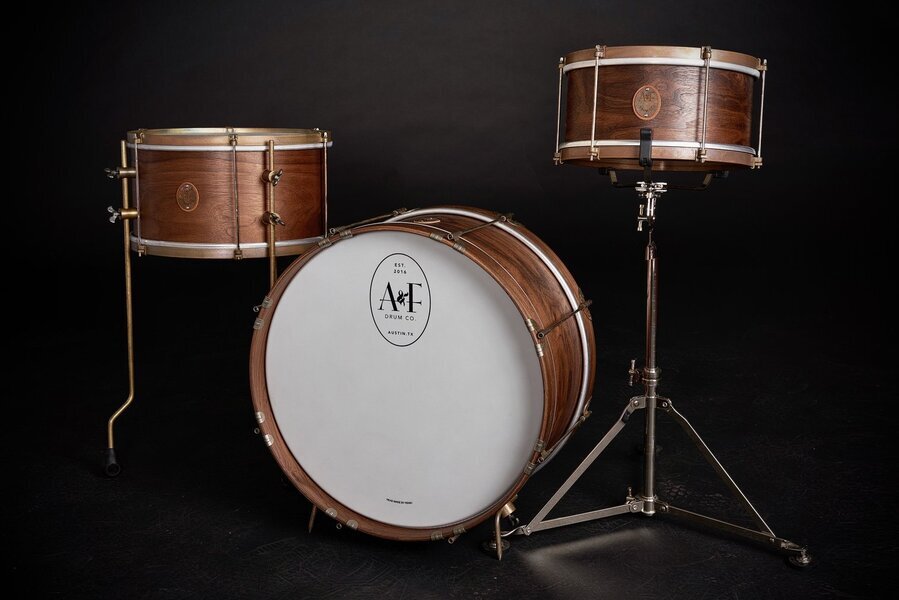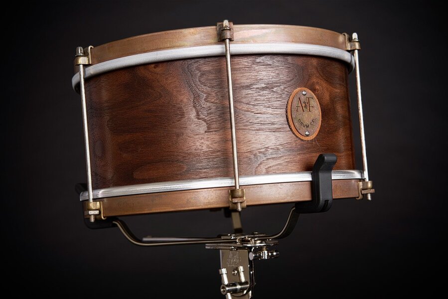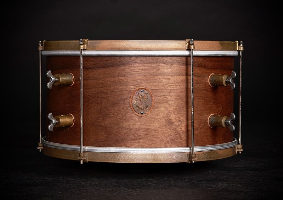 Made with our exclusive 7 ply Walnut/Hickory Shells with a oiled Walnut finish shells, clear maple hoops, exclusive A&F Kick spurs and brackets, and single tension hardware. These drums really sing in low-mid tunings. We mark inside the top hoops for proper lug claw placement when changing heads!