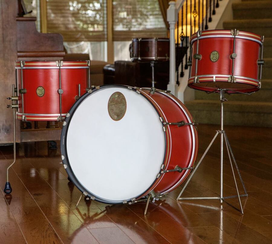 Our ANTIQUE RED Mahogany Kit is made with A&F's exclusive thin mahogany/poplar shell composition, no re-rings or inside edge, our outside reverse baseball bat edge, raw brass hoops on Rack Toms, raw brass or wood striped hide-a-hoops on the floor tom, patented raw brass hardware. These drums tune lower then their size balanced with perfect punch and attack AND are extremely microphone friendly!