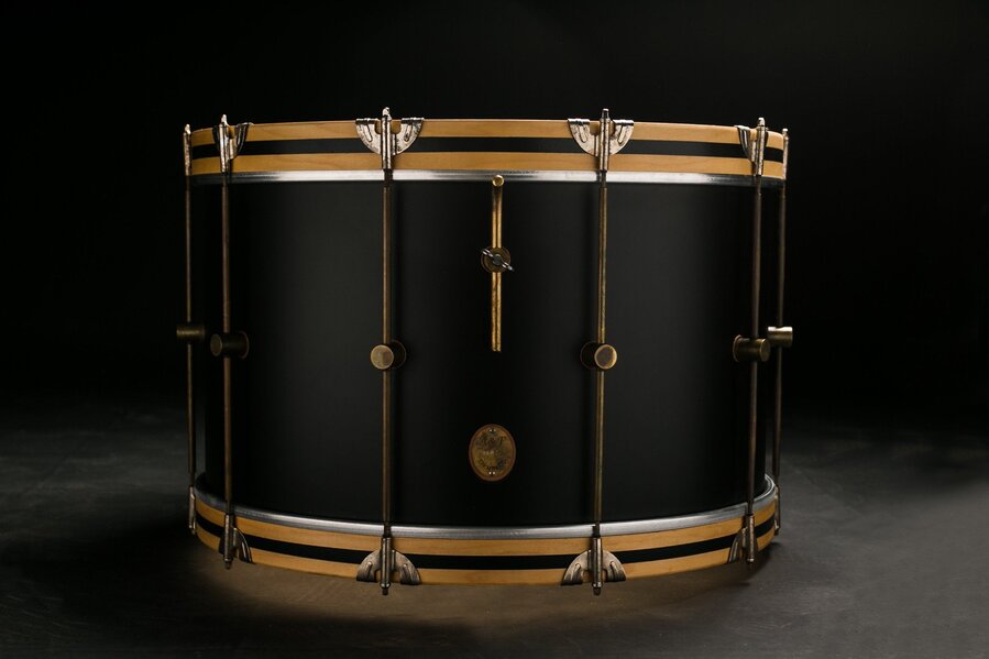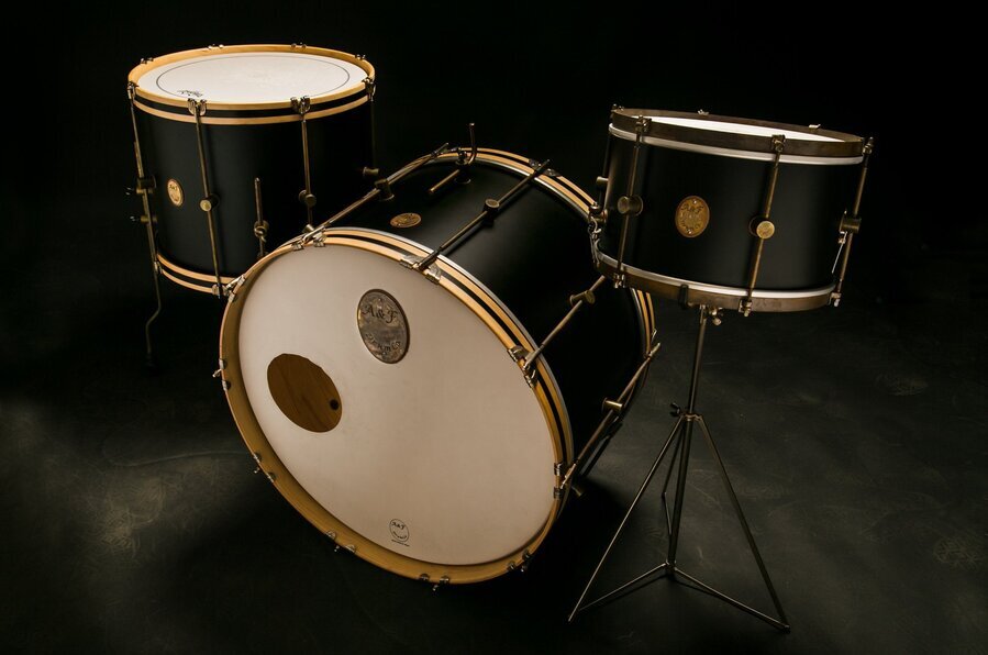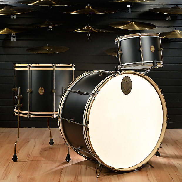 Our Black Maple Kit is made with A&F's exclusive thin maple/poplar shell composition, no re-rings or inside edge, our outside reverse baseball bat edge, raw brass hoops on Rack Toms, raw brass or wood striped hide-a-hoops on the floor tom, patented raw brass hardware. These drums tune lower then their size balanced with perfect punch and attack AND are extremely microphone friendly!