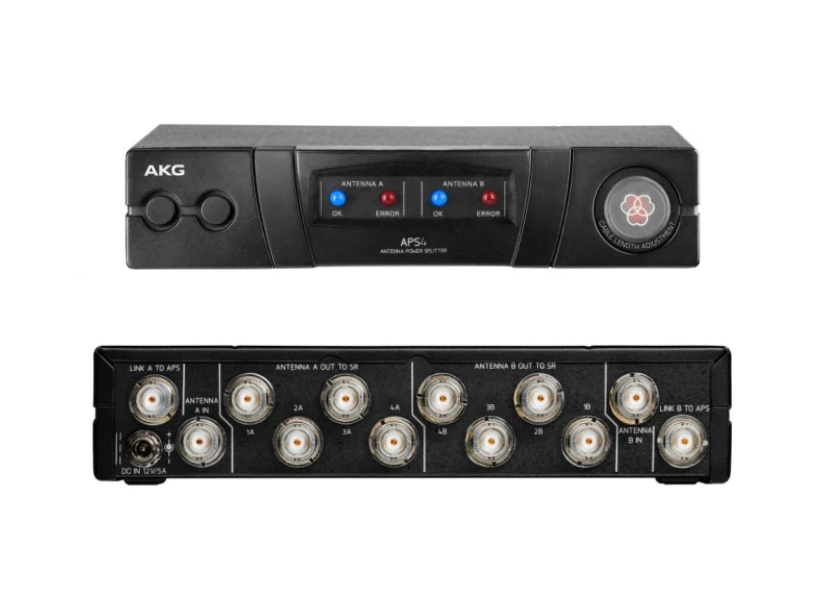 AKG Aps4 Antenna Power Splitter No Psu | Mooloolaba Music Australia Operates in an extended frequency range from 470 to 952 MHz for maximum flexibility Cable length adjustment switch for optimizing antenna signal levels Link output to cascade up to three APS4 for larger systems Remote power for antennas and receivers to eliminate any extra installation effort Switching bandwidth (from/to): 470 to 952 MHz