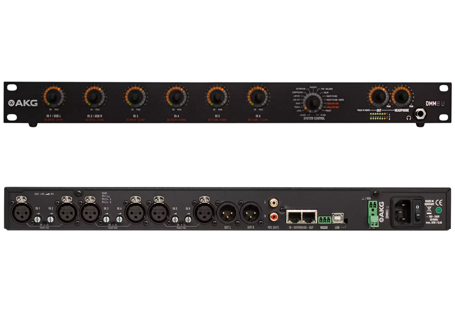 AKG Auto Mic Mix 6 Ch Mic/Line Input | Mooloolaba Music Australia 12-band graphic EQ on outputs for optimized loudspeaker tuning Six programmable presets for easy tailoring to different situations Two channel USB streaming In and Out to interface with IT networks Up to ten units can be cascaded for simultaneous use of up to 80 channels Bits: 24 Operating temperature range: 0 to 40 Celcius Rack height: 1 RU Rack size: Full Racksize (19) Sampling rate: 48000