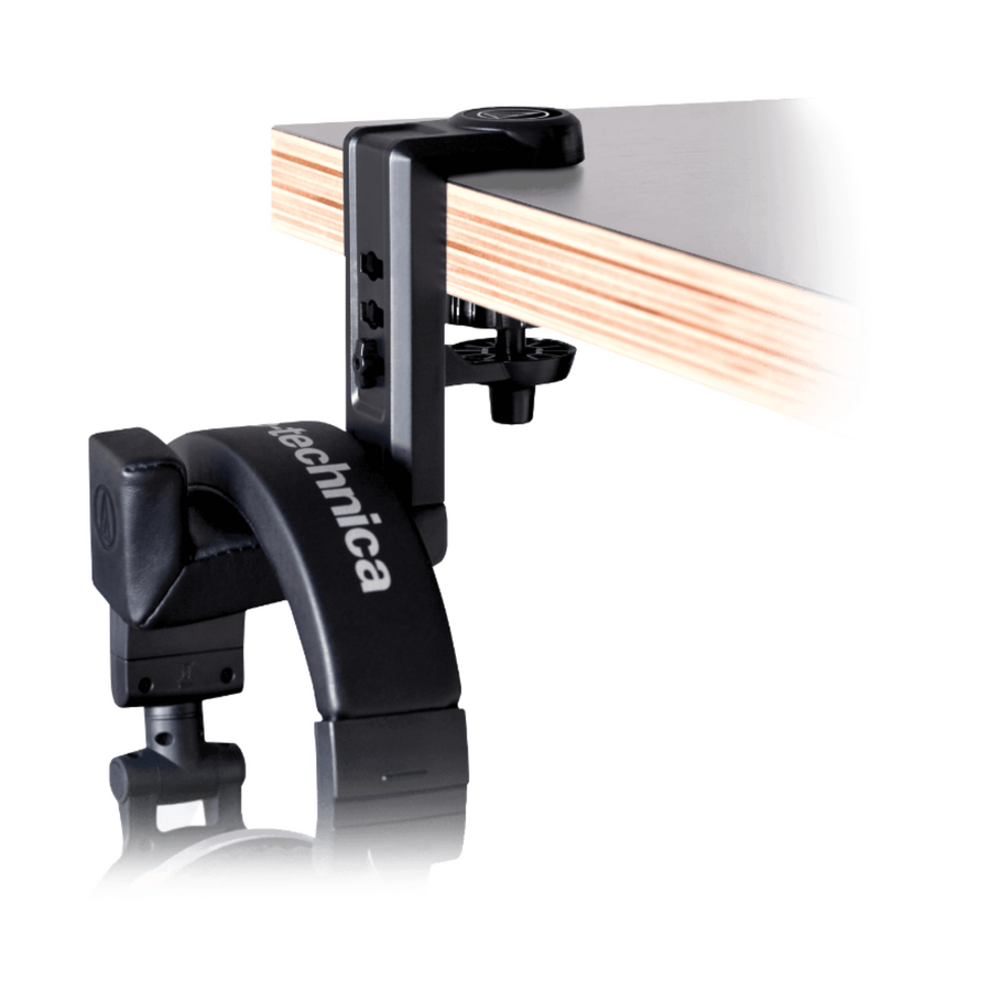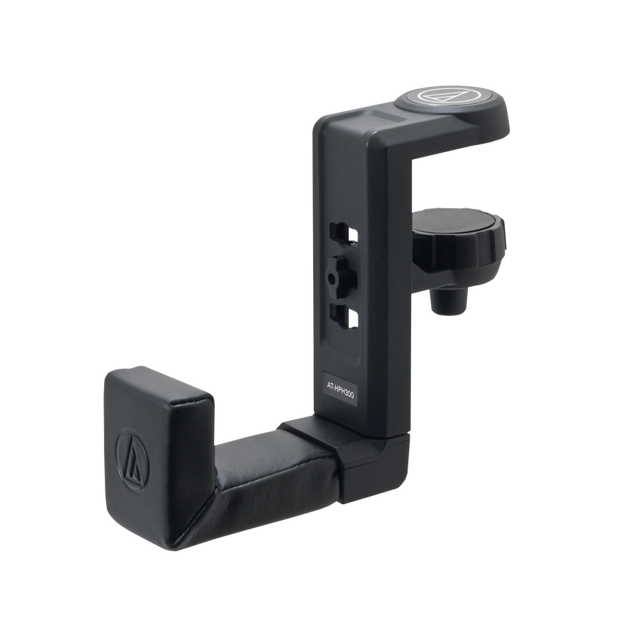 The AT-HPH300 Headphone Hanger is a convenient tool for safely storing your headphones in areas where space is limited. The hanger features an adjustable clamp that mounts securely to a shelf, desk or other surface up to 3.5 mm (1.4") thick. The hanger rotates 360°, allowing you to store headphones unobtrusively under the desk or shelf, or have out and at the ready to quickly grab when needed. And with the hangers soft leatherette pad, you never have to worry about your headphones getting scratched or damaged. A great space-saving solution.