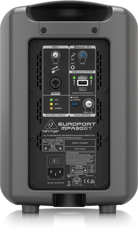 Use the extremely lightweight, yet powerful EUROPORT MPA30BT PA system to stream songs from your Bluetooth-enabled iOS device at the next company picnic, or to get your message across on the playing field. With its 30-Watt amplifier and premium 2-way speaker system, the MPA30BT provides superb sound for up to 100 people and the rechargeable battery lasts up to 20 hours. You can use a traditional-style microphone, or up to 2 of our ULM digital microphones (mics not included) to create a supremely easy-to-use wireless, go-anywhere PA system!