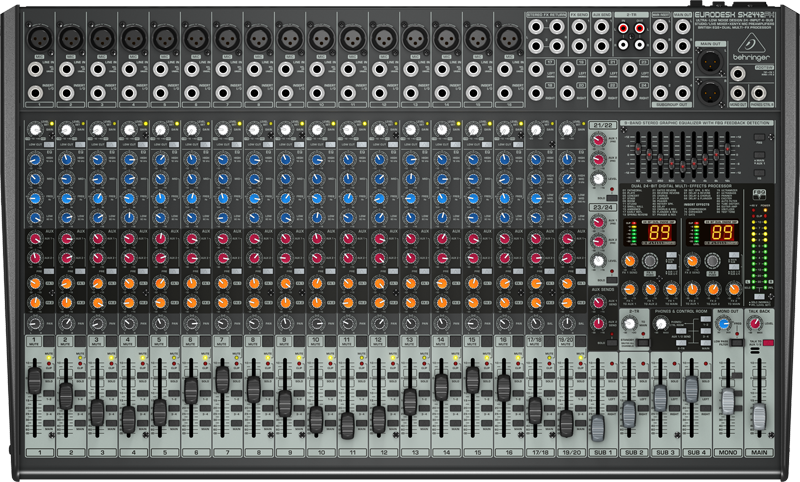 The 24-Input SX2442FX comes equipped with 16 of our legendary, Phantom powered XENYX Mic Preamps, 4 stereo Input channels, 2 Aux Sends and 2 stereo FX Returns, plus Inserts on all mono channels. Other features include: 4 Subgroups for mixing versatility; Main Inserts (the ideal path for connecting graphic equalizers or compressor/limiters); Mono Out with sweepable Low-Pass Filter for direct connection to active subwoofers and a dedicated Talkback channel, with a built-in mic for communicating with the talent.