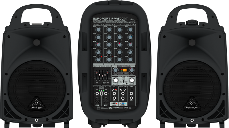 The EUROPORT PPA500BT has everything you need for virtually any medium to large gathering a lightweight, 500-Watt wireless-ready 6-channel mixer-amplifier with +48 V phantom power that can handle 2 microphones, two stereo or 4 mono musical instruments and your favorite Bluetooth audio player. Plus, you get exceptional 2-band channel EQ and a 5-band stereo graphic EQ with our revolutionary FBQ Feedback Detection System.