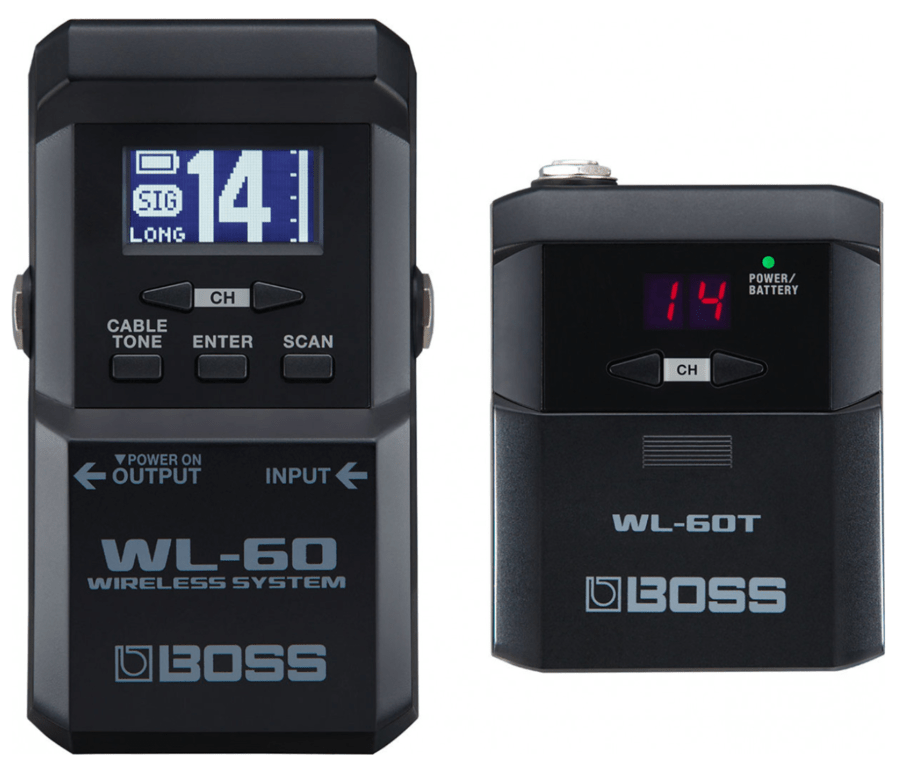 SPECIFICATIONS (RECEIVER) Wireless Format BOSS proprietary digital audio format Wireless carrier frequency 2.4 GHz Compatible Channels 14 (May vary due to local conditions) Transmission Range 65 feet line-of-sight (May vary due to local conditions) Latency 2.3 ms Dynamic Range 110 dB or greater Frequency Response 20 Hz--20 kHz Nominal Input Level -10 dBu Input Impedance 1 M ohm Nominal Output Level -10 dBu Output Impedance 1 k ohm Recommended Load Impedance 10 k ohms or greater Controls CH button SCAN button ENTER button CABLE TONE button Indicators Graphic LCD 64 x 32 dots Connectors INPUT jack: 1/4-inch phone type OUTPUT jack: 1/4-inch phone type IN jack OUT jack Power Supply Alkaline battery (AA, LR6) x 2 AC adaptor (sold separately) Current Draw 70 mA Expected battery life under continuous use Alkaline battery (AA, LR6): Approximately 10 hours * These figures will vary depending on the actual conditions of use. Accessories Owner's Manual Leaflet USING THE UNIT SAFELY Transmitter Guitar cable Rubber foot x 4 Alkaline battery (AA, LR6) x 2 Options (sold separately) AC adaptor: PSA-S series Parallel DC cord: PCS-20A (DC Plug x8) SIZE AND WEIGHT (RECEIVER) Width 70 mm 2-13/16 inches Depth 120 mm 4-3/4 inches Height(excluding rubber foot) 54 mm 2-1/8 inches Height(including rubber foot) 57 mm 2-1/4 inches Weight (excluding battery) 180 g 7 oz Weight (including battery) 220 g 8 oz SPECIFICATIONS (TRANSMITTER (WL-60T)) Nominal Input Level -10 dBu (1 M ohm) Controls POWER switch CH button Display 7 segments, 2 characters (LED) Indicator POWER/BATTERY Connectors INPUT jack: 1/4-inch phone type Power Supply Alkaline battery (AA, LR6) x 2 Current Draw 110 mA Expected Battery Life Under Continuous Use Alkaline battery (AA, LR6): Approximately 25 hours * These figures will vary depending on the actual conditions of use. SIZE AND WEIGHT (TRANSMITTER (WL-60T)) Width 68 mm 2-11/16 inches Depth 88 mm 3-1/2 inches Height (including strap clip) 30 mm 1-3/16 inches Weight (including battery) 120 g 5 oz * 0 dBu = 0.775 Vrms *The specifications are subject to change without notice.