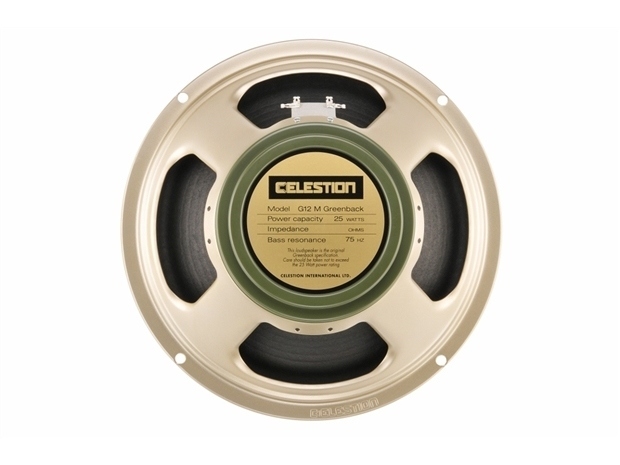 Celestion's first guitar loudspeaker featuring a ceramic magnet structure, the G12M Greenback presented almost as much magnetic flux to the voice coil as an Alnico formulation, but in a much more compact space. As a result the Greenback became the guitar loudspeaker that paved the way for use with higher power amplifiers. And, of course, the ceramic magnet presented its own unique tonal characteristics. The Greenback has a loud and assertive character that sounds great through a valve amp pushed into overdrive. The speaker has evolved over the decades and still presents that instantly familiar woody tone, delivered with a knockout punch. Chassis type Pressed steel DC resistance, re Available 6.7? or 13.1? Frequency range 75-5000Hz Magnet type Ceramic Magnet weight 35oz, 0.99kg Nominal diameter 12", 305mm Nominal impedance Available 8? or 16? Power rating 25Wrms Resonance frequency, Fs 75Hz Sensitivity 98dB Voice coil diameter 1.75", 44.5mm Voice coil material Round copper Mounting Information Cut-out diameter 11.1", 283mm Diameter 12.2", 309mm Magnet structure diameter 5.9", 150mm Mounting slot dimensions 0.31", 7.9mm Ø Mounting slot PCD 11.7", 297mm Number of mounting slots 4 Overall depth 5.1", 130mm Unit weight 7.9lb, 3.6kg