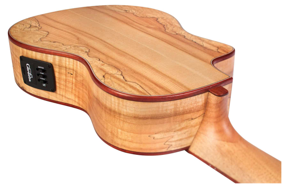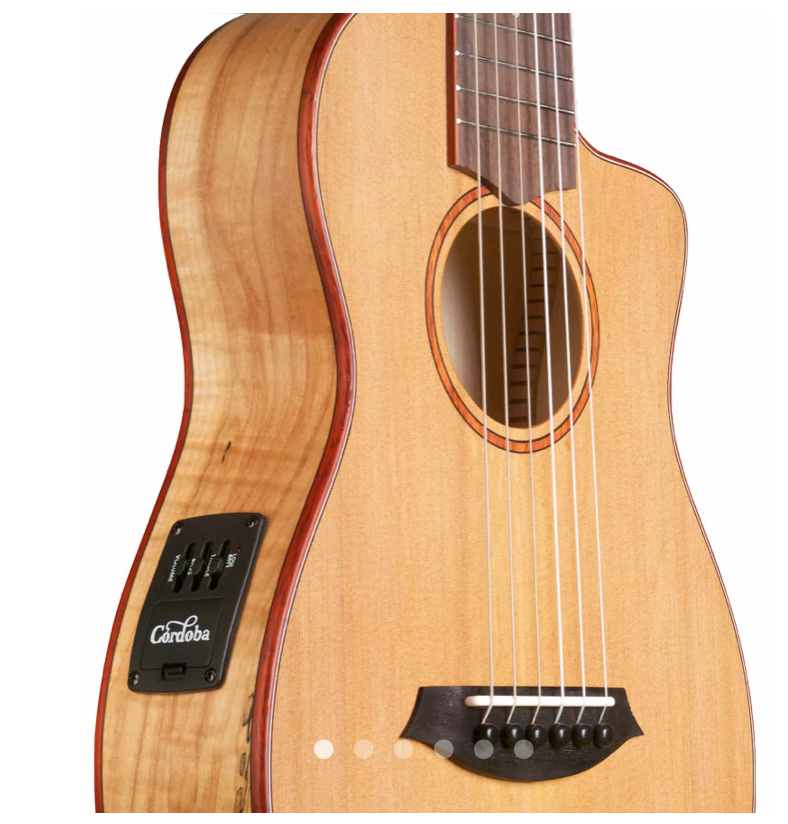At first glance, the Mini SM-CE clearly stands out from other travel sized guitars, with its solid cedar top and striking spalted maple back and sides accentuated by a padauk rosette and binding. The solid cedar top provides a warm tone that’s nicely complemented by the brightness of the spalted maple, resulting in an instrument that really projects its voice. For those who want to plug and play, the Cordoba Mini SM-CE features a soft cutaway and Cordoba 2Band pickup. The hallmark of Cordoba’s Mini guitars is the comfortable feel and string spacing of a full size guitar. The Mini SM-CE also includes a thin U-shaped neck outlined with padauk binding, 48mm (1.9”) nut width, and 510mm (20”) scale length.