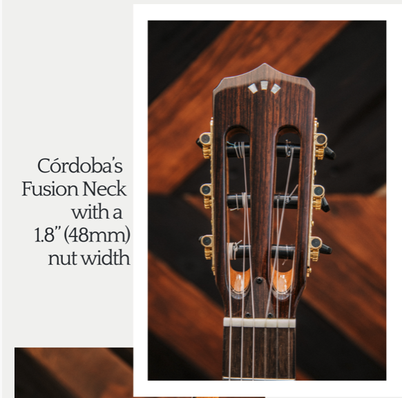 Cordoba’s unique Fusion Neck with a comfortable 48mm nut width and fast 16” Fretboard Radius is slightly thinner than a traditional nylon string guitar and provides a playing experience closer to that of a steel-string guitar. This familiarity offers an easy transition for steel-string players and players with smaller hands to the world of nylon string guitar. The stage-friendly body shape with 1.5” (40mm) body thickness, a scaled-down perimeter, and meticulously carved contours provide ergonomic comfort to players of any style. The deep cutaway gives easy access to the higher frets perfect for on-stage solos that surpass the 10th fret.