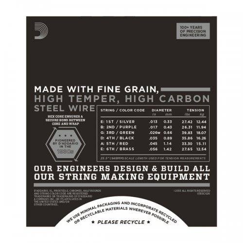 ECG26, D'Addario's heaviest gauge flatwound set, delivers a smooth feel, warm/mellow tone and maximum tension, ideal for traditional jazz playing. D'Addario Chromes are wound with flattened stainless steel ribbon wire which is polished to an incredibly smooth surface. Chromes deliver a distinctive damped but tone-rich sound that only flatwounds can produce. D'Addario Chromes are the world's most popular flatwound strings.