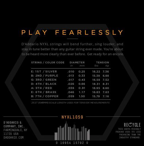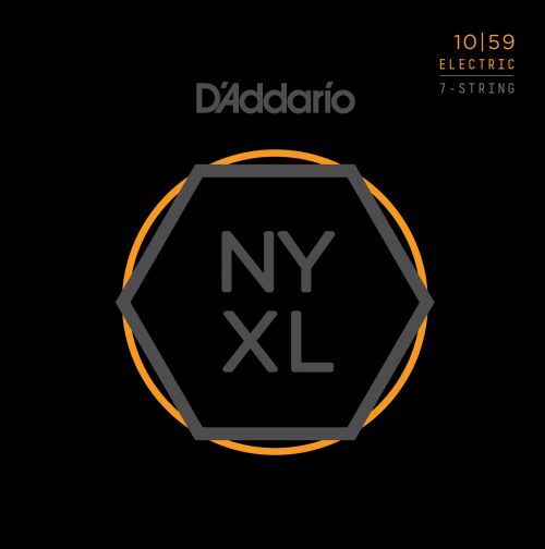 NYXL1059 is designed with the most popular 7-string gauges for comfortable playability and an ideal electric tone. DAddario NYXL guitar strings will bend farther, sing louder, and stay in tune better than any string youve played before. Envisioned, perfected, and manufactured by DAddario in New York, this newly engineered, break-resistant, high-carbon steel core and plain steel alloy delivers a whole new level of freedom, confidence, and power. NYXLs provide more strength and up to 131% greater tuning stability by utilizing a completely reinvented wire drawing process coupled with a revolutionary fusion twist process for the plain steels. The reformulated nickel plated string windings have greater magnetic properties resulting in higher output and enhanced mid-range frequency response for more presence and crunch.