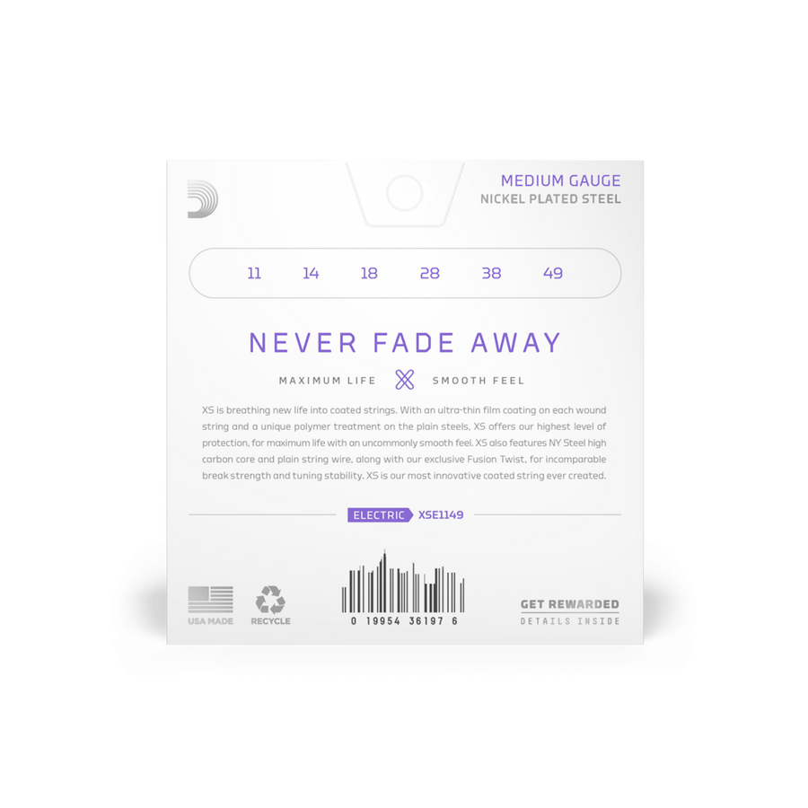 XS Nickel coated electric guitar strings provide the longest life of any D’Addario electric guitar string. Coated with our groundbreaking XS coating, these premium electric strings attain maximum life and a smooth, fast feel without dampening their outstanding tone. Constructed with a NY Steel core, reformulated nickel-plated steel wrap wire, and Fusion Twist technology, XS Nickel strings boast superior strength and tuning stability, plus richer harmonics, greater clarity, and remarkable definition with every sweep, slide, and bend. This 11-49 Medium gauge set provides increased volume, with slightly more tension and resistance.