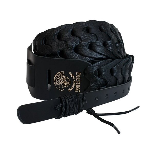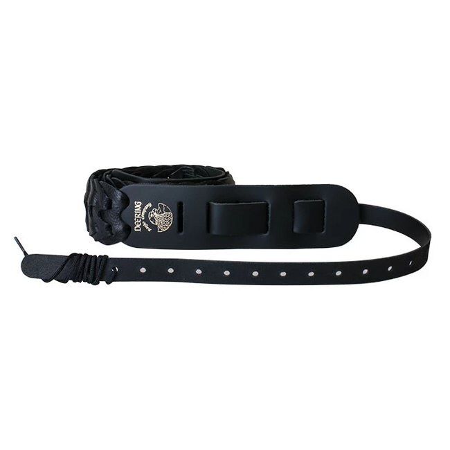 Supple and soft, this 2” black, double-link woven leather cradle strap is made in the USA, with the gold Deering eagle logo design. Banjo players will love the way it safely cradles their banjo and cushions their shoulder during hours of playing. This strap will fit all Deering, Vega, and Goodtime model banjos. Chicago Screw Ends and Shoe Lace attachment included.