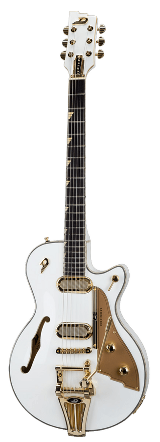 The Starplayer TV Phonic is a semi hollow, dual pickup, 22 fret electric thinline guitar, featuring arched top and flat back, bent sides, gold plated hardware and a 648mm scale. With the Starplayer TV Phonic in an all-over bright Venetian White we are continuing our vision of truly independent hardware design. As the first model in our Starplayer TV line it features our new spectacular "Phonico" pickup covers and the 4-way rotary pickup selector placed at the cutaway. The Phonic comes with our celebrated set of a GrandVintage humbucker for the bridge and Domino P90 for the neck position. The new pickup selector allows you to choose between each pickup individually or two options of combining the two. The first option lets both pickups run freely without touching the frequencies, while the second option filters certain frequencies to give your tone a unique and even more defined character. It is further equipped with a selection of world-class Duesenberg hardware such as the stunning Radiator Tremolo unit, the Steel Saddle Radius Bridge and effortless Z-Tuners for smooth and easy string changes and tuning.