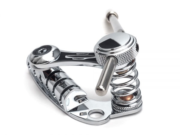 The Duesenberg Les Trem is a compact and simple to install tremolo system for guitars featuring a tune-o-matic bridge and stop-tailpiece. It can be mounted on the bushings of a standard stop-tailpiece and does not require any modification to the body of the guitar. If you want to, you can remove it and install the stop-tailpiece back again in seconds.