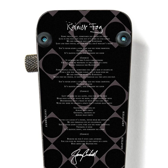 The super popular Jerry Cantrell Cry Baby Wah just got a makeover, and it’s all about going back to the riff master’s Seattle roots. The distressed black finish recalls the visual vibes of the Alice in Chains record Rainier Fog while the custom treadle design is based on Jerry’s own tribal orca tattoo, created by Coast Salish artist Joe Wilson. As a sweet final touch, the bottom plate features the full lyrics to the song “Rainier Fog” from the aforementioned album.