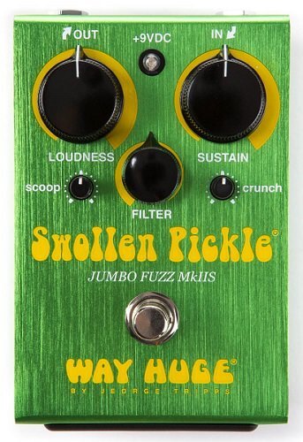 Surrenders super high-gain fuzz with copious amounts of smooth low-end to all who dare plug into it. With a twist of the sustain control, you’re taken from mild crunch to Armageddon! The filter control retains its trademark insane range of heavily filtered tones, distinguished by remarkable girth and sizzle and the loudness puts out enough volume to clobber any amp! Newly added features include a tone stack scoop control that elicits classic Swollen Pickle mid-scoop or a flat, mid-frequency sweep and a crunch knob to adjust the compression intensity of the fuzz. Finally under the hood the Swollen Pickle MK IIS has two internal mini controls; a voice control sets the intensity of the external scoop control from light to heavy mid-cut and a clip control varies between two sets of clipping diodes for smooth to opened fuzz sustain. Now in a smaller, more pedal board friendly housing. True hardwire relay bypass. Powered by 9 volt battery or AC adaptor (ECB003) (not included).