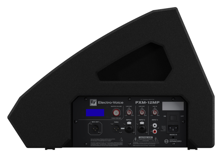 The integrated mixing section provides 3 input channels: 2x XLR / ¼” combination connectors and a stereo RCA input. The DSP offers 4 EQ presets, high and low shelving, parametric midrange EQs, adjustable low-cut filters, a tunable feedback notch filter, and recallable user settings. The Class-D 700W amplifier provides enough power to satisfy the most demanding monitoring requirements, and system protection and limitation designed by Electro-Voice ensures that the PXM-12MP will play loudly and consistently even at the edge of its specifications.