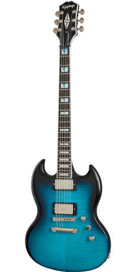 The Epiphone Prophecy SG brings high-performance features to the classic SG design, making it an excellent choice for today's progressive guitarists. The mahogany body is topped with a 1/2" maple cap and beautiful AAA flame maple veneer, along with a thinner Aged Vintage Gloss finish. The SlimTaper asymmetrical mahogany neck features a 24 fret ebony fingerboard with jumbo frets, Block and Triangle pearloid/abalone inlays with abalone selected to complement the body color, brushed nickel Grover Locking Rotomatic tuners, and a black Graph Tech NuBone nut. The Epiphone Prophecy SG comes with brushed nickel hardware and is equipped with a pair of proprietary Fishman Fluence pickups with three voicing options that are selected with the push/pull master volume and tone controls - high gain, modern active high-output humbucker with both controls pushed in, classic Patent Applied For-style humbucker when the tone control is pulled out, and shimmering, optimized single-coil tones when the volume control is pulled out. Optional hardshell case, EpiLite case, and premium gig bag available.