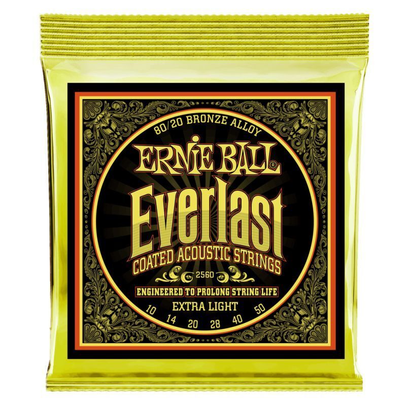 Ernie Ball 2560 Everlast Light Coated 80/20 Bronze Acoustic Extra 10-50 Gauge Everlast Coated acoustic strings use groundbreaking nanotechnology that repels unwanted moisture and oils that negatively impact your tone. Our proprietary treatment is applied to both the inner hex core and outer wrap wire to provide ultimate protection without compromising tone or feel. Made from 80% copper, 20% zinc wire wrapped around hex shaped brass plated steel core wire providing a crisp, ringing sound with pleasing overtones. Gauges .010,0.014,0.02,0.028,0.04,0.05