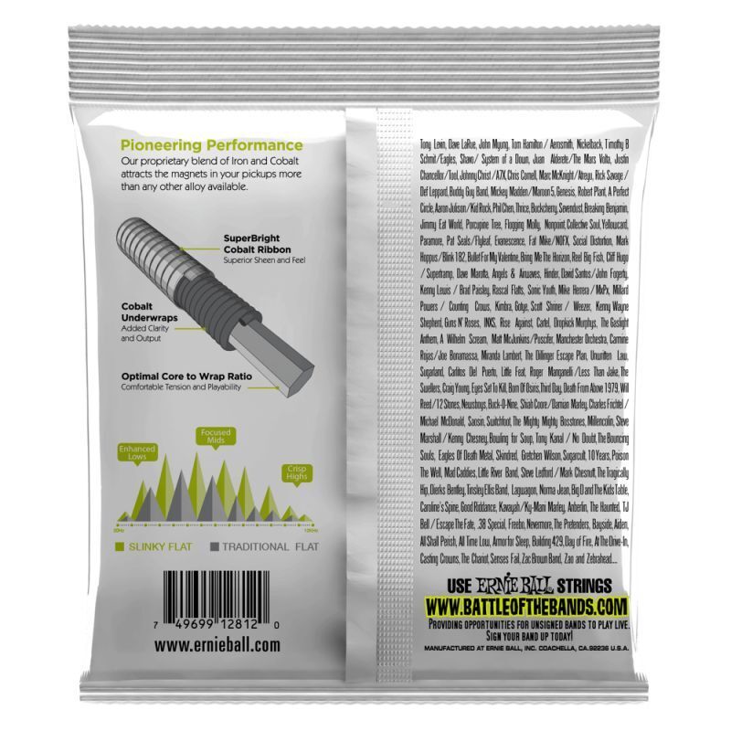 Ernie Ball 2812 Regular Slinky Flatwound Electric Bass Strings 50-105 Gauge Ernie Ball Slinky Flatwound Bass Strings combine the smooth feel of traditional flats and the power of Cobalt. Featuring a SuperBright Cobalt ribbon wrap, Cobalt underwraps and optimal hex-core to wrap ratio, the new Flatwound Bass strings are the first flat that actually feels like a flat and sounds like a round. Gauges .050 .070,0.085,0.105,