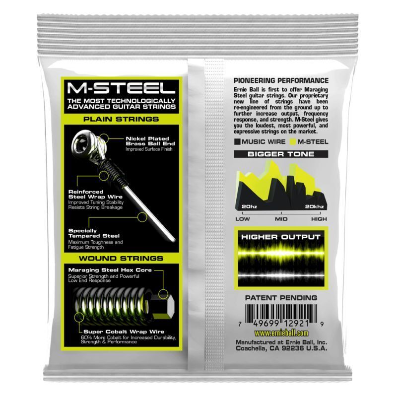 Ernie Ball 2921 Regular Slinky M-Steel Electric Guitar Strings 10-46 Gauge The loudest, most expressive strings ever created providing increased output, frequency response, and strength. M-Steel, short for Maraging Steel, is a superalloy used in high stress applications for the aerospace and defense industries. The wound strings are comprised of a patented Super Cobalt alloy wrapped around a Maraging steel hex core wire, producing a richer and fuller tone with powerful low end response. M-Steel plain strings are comprised of a specially tempered steel for maximum fatigue resistance. A patented winding of steel around the ball end of the plain strings reduces slippage, breakage and stays in tune better than conventional plain strings. Gauges .010,0.013,0.017,0.026,0.036,0.046,