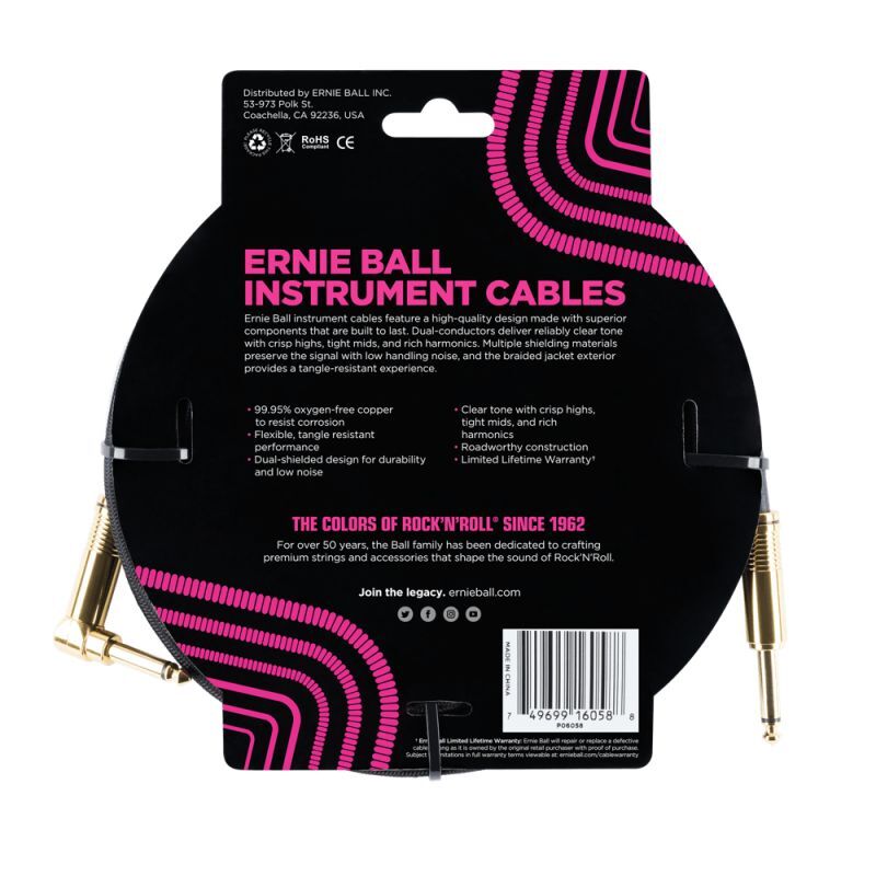 Ernie Ball instrument cables feature a high-quality design made with superior components that are built to last. Dual-conductors deliver reliably clear tone with crisp highs, tight mids, and rich harmonics. Multiple shielding materials preserve the signal with low handling noise, and the braided jacket exterior provides a tangle-resistant experience. Cable length 25ft (7.62m).