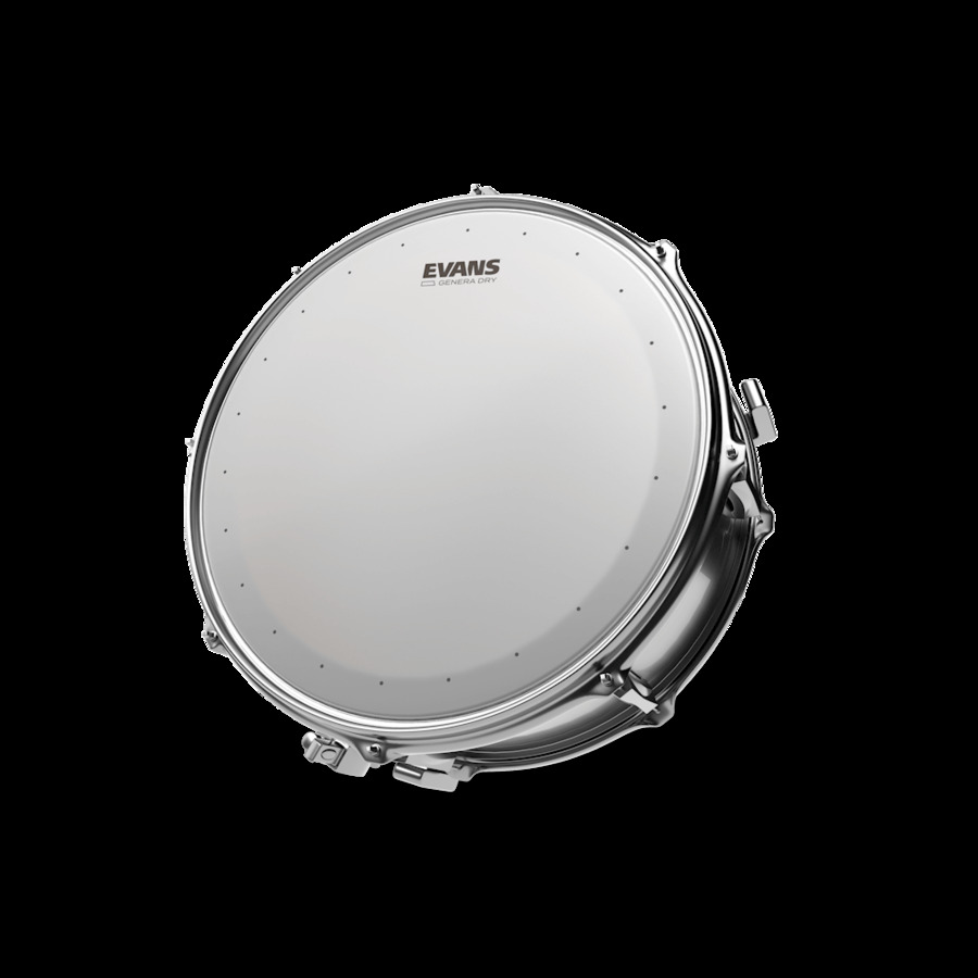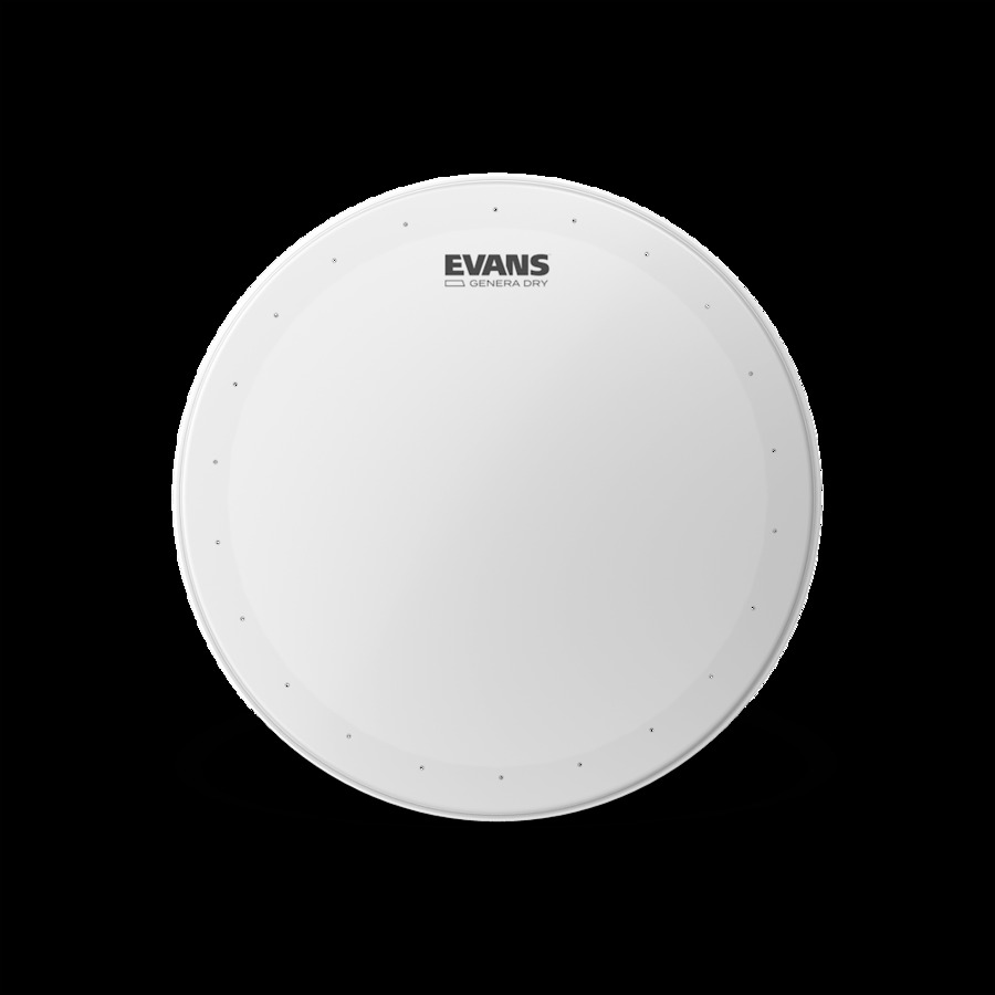 Evans Genera Dry snare drumheads feature a single ply of 10mil film, plus a 2mil overtone control ring on the underside that floats with the head, eliminating excessive overtones and controlling sustain. Precision-drilled dry vents around the perimeter of the head further reduce overtones and sustain.