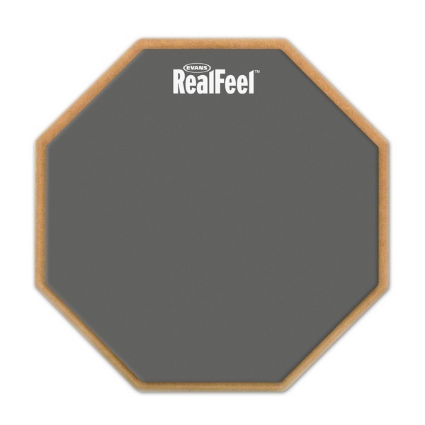 12" two sided pad with gum rubber and neoprene surfaces Features a natural gum rubber playing surface with a dark gray fabric finish which resists wear and tear Also available in single side version and a 6" version All RealFeel by Evans drum pads are designed, engineered and manufactured to the most stringent quality controls in the industry