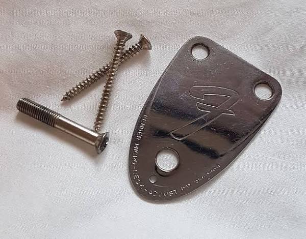 FENDER Neckplate ""F"" 3-hole American Vintage '70s chrome Neck plate American Vintage '70s, for guitar,' F-logo ', chrome, 3 bolt. Including screws.