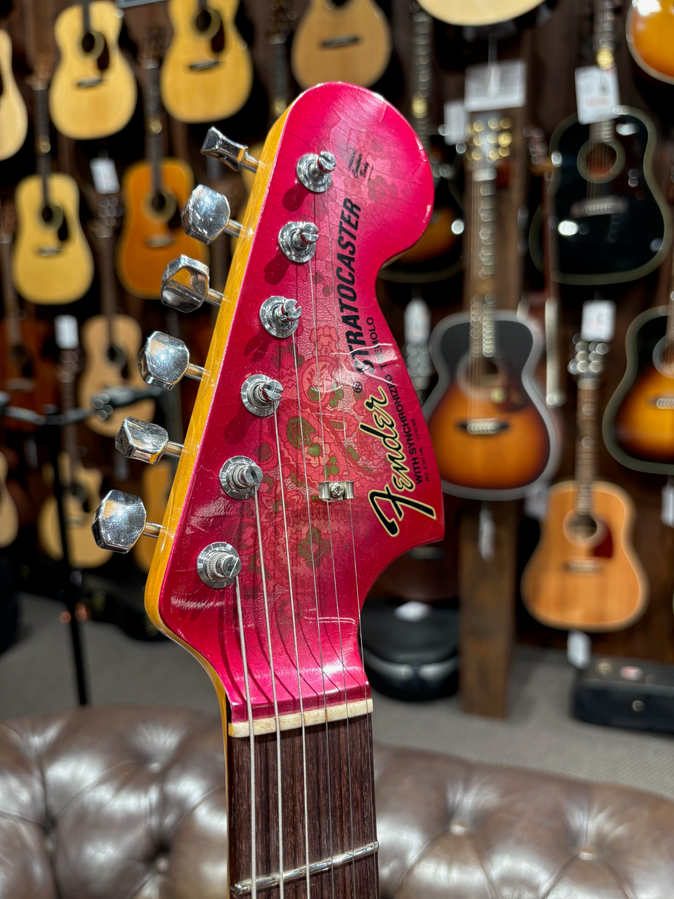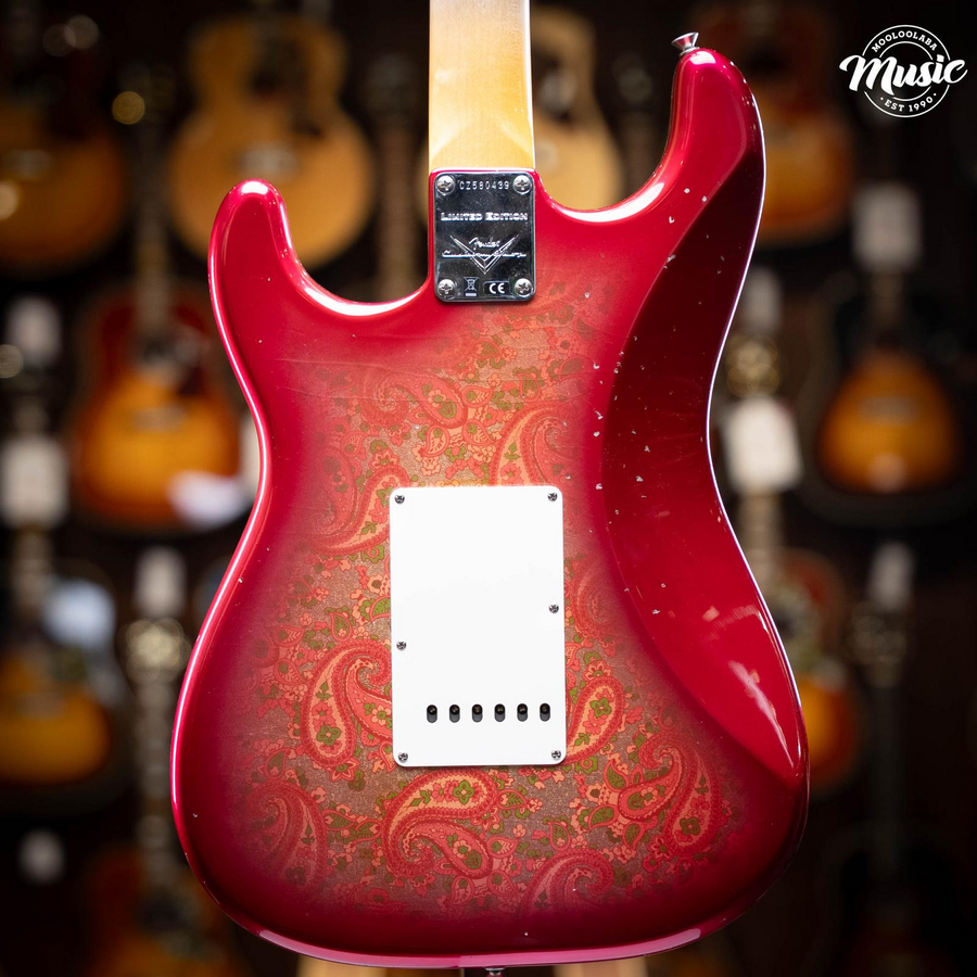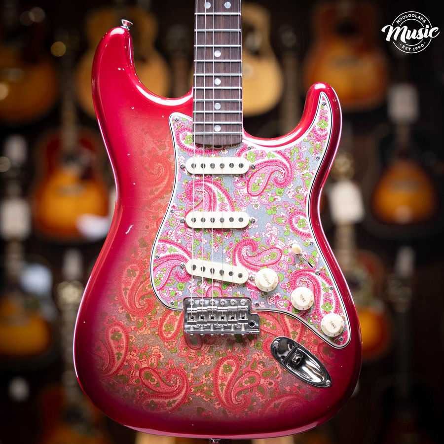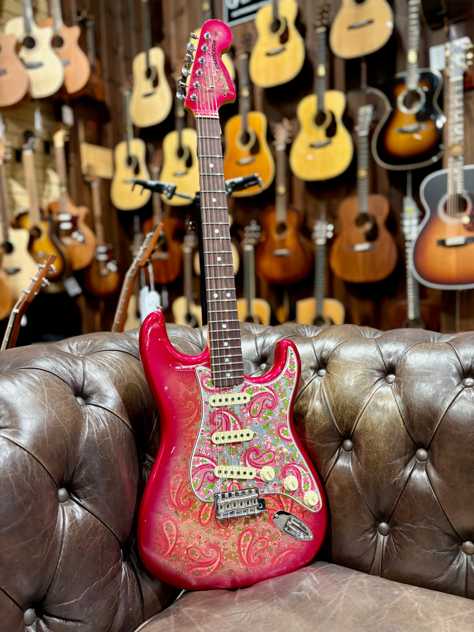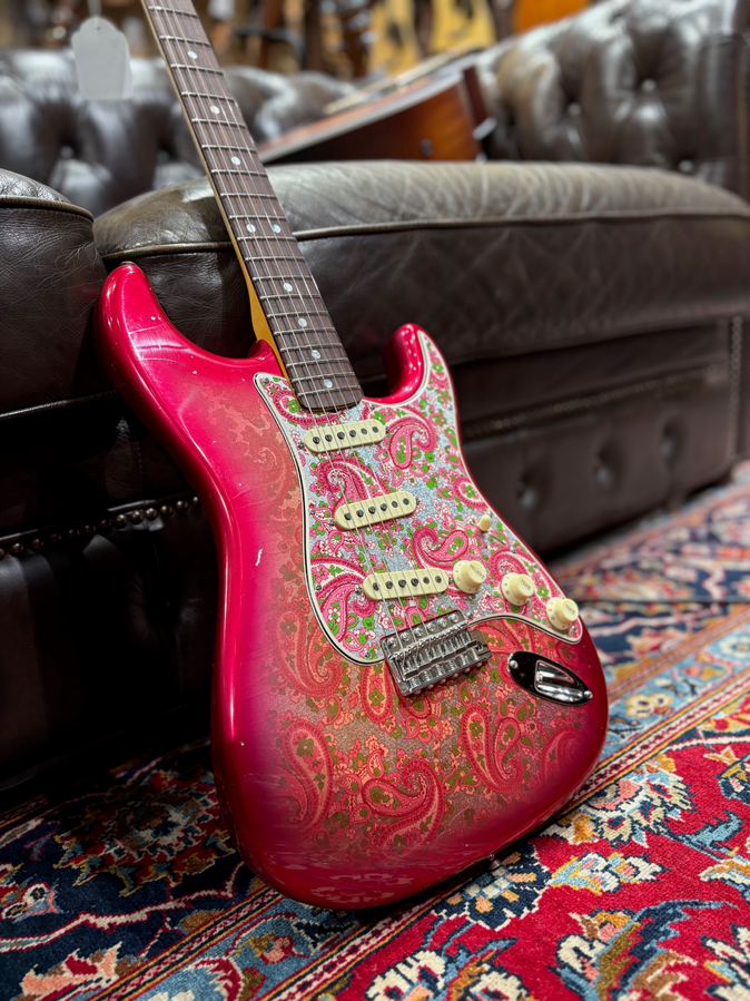 BODY - ALDER 2 PC COLOR - PINK PAISLEY FRONT & BACK BODY FINISH - NITRO LACQUER BODY FINISH - PAISLEY/FLORAL - FRONT/BACK NECK STYLE - CUSTOM NECK NECK ASSEMBLY - 69 STRAT RW CC/REL BACK SHAPE - 63 STRAT STYLE "C" FINGERBOARD RADIUS - 9.50" RADIUS NECK - THICKNESS AT 1ST FRET - .810" NECK - THICKNESS AT 12TH FRET - .970" NECK - BLANK GUITAR MAPLE RIF SAWN SIDE DOT - MOTHER OF PEARL 3/32" FACE DOT - MOTHER OF PEARL 7MM FRET WIRE - NARROW TALL / 6105 NUT - BONE (GTR & J-BASS) NECK FINISH - MED TINT NECK FINISH - NITRO LACQUER NECK FINISH - PAINTED HEAD CAP FINGERBOARD - GUITAR CITES RW AAA 9 MM FRETS - ROUND LAM FINISH PACKAGE - JOURNEYMAN W/CC HRW PLATING - CHROME/NICKEL HARDWARE STANDARD OR CUSTOM PICKGUARD - CUSTOM PICKGUARD SHAPE - 63-69 STRAT. PICKUP SELECTOR SWITCH - SWITCH 5-WAY LEVER CRL PICKUP NECK POSITION - HW 69 STRAT CC PICKUP MID POSITION - HW STRAT FAT 50'S MID CC PICKUP BRIDGE POSITION - HW STRAT TEX SPCL BRG CC RIGHT/LEFT HAND - RIGHT HAND BRIDGE ASSEMBLY - C/S VINT STRAT CC OUTPUT ASSEMBLIES - VINT STRAT CC CONTROL ASSEMBLY - STRAT VINT MOD WIRING #2 CC NECK PLATE - GTR ENGRAVED LTD ED CHR CC BACK PLATE & TREM COVER - GTR STRAT PARCH REL REAR CONTROL COVER - NONE STRAP LOCKS - NO STRAP LOCKS SELECTOR SWITCH TIP - VINT WHITE REL KNOB TONE - STRAT SM FT TONE VINT WHT REL TREMOLO ARM TIP - AMERICAN VINTAGE WHITE RELIC KNOB VOLUME - STRAT SM FT VOL VINT WHT REL TUNER KEY - SCHALLER F KEY CC STRING SETS FOR GUITAR - 010-013-017-026-036-046 TREMOLO ARM - VINTAGE UPGRADED 60'S CC CASE - FCS STRAT/TELE BLACK