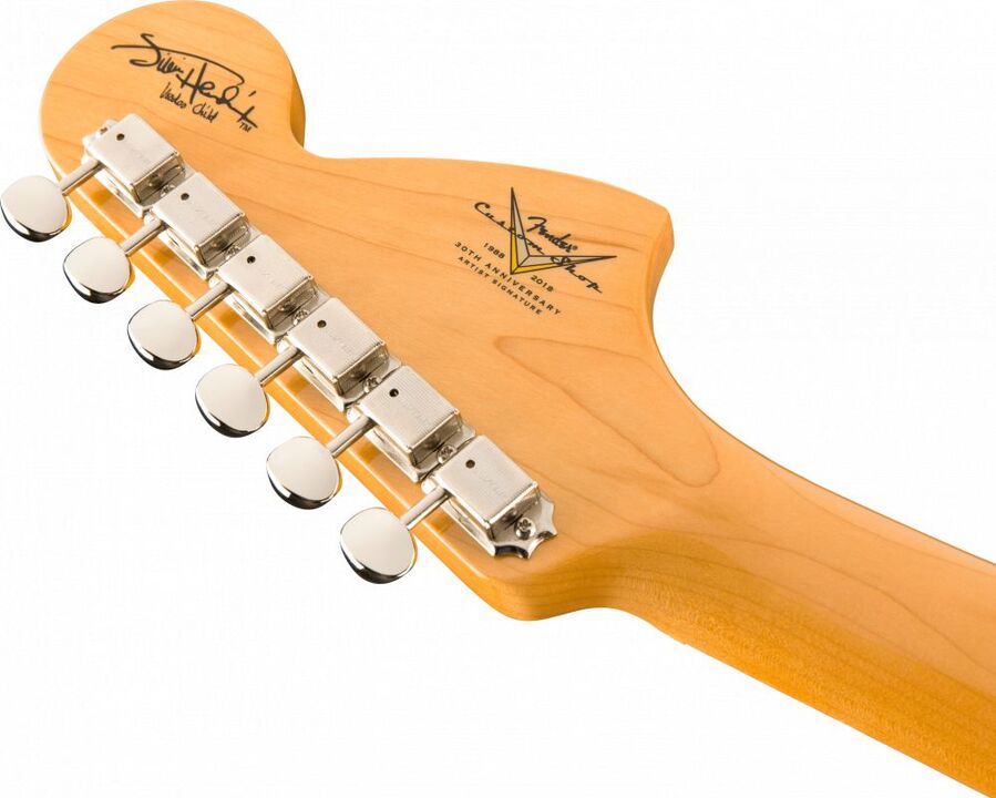Jimi Hendrix was the quintessential innovator of modern music. A left-handed player who wielded a right handed-guitar, he rewrote the vocabulary of contemporary guitarists with the fiery tone of his “upside-down”, reverse-strung instrument. The sounds he created with his Strat® informed his inventive technique—and in turn his songwriting—in a synergistic relationship that birthed a legend. The Voodoo Child Strat is your chance to directly experience the tone and essential configuration of his guitars, recreated for right-handed players by the artisans of the Fender Custom Shop.
