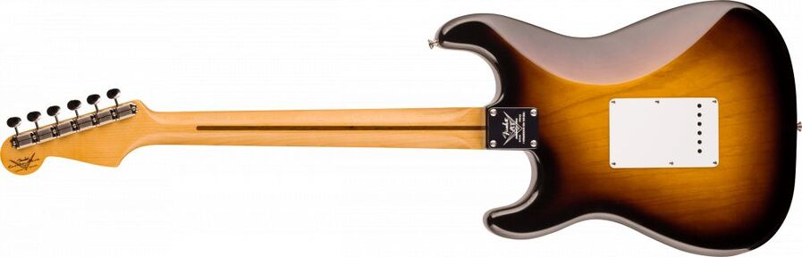 Its one-piece quartersawn maple neck is fashioned with a special 70th anniversary Soft “V” profile based on an incredible Strat® neck from July 1954. This is topped with vintage compound-radius fingerboard (7.25” to 9.5”) with 21 medium vintage (47095) frets and a 1.625” bone nut. Three Custom Shop hand-wound ’54 Strat® pickups deliver that classic Strat® voice with clear, bell-like highs, routed through vintage '54 Strat® wiring with wax paper cap and five-way switching. Other premium features and authentic first-year Strat® appointments include a single-ply white pickguard and serial-number back plate, 1954-style ABS white pickup covers and control knobs, Custom Shop vintage synchronized tremolo bridge, vintage-style tuners, disc string tree, special 70th Anniversary Stratocaster® neck plate, deluxe embroidered hardshell case, special “case candy” kit and certificate of authenticity.