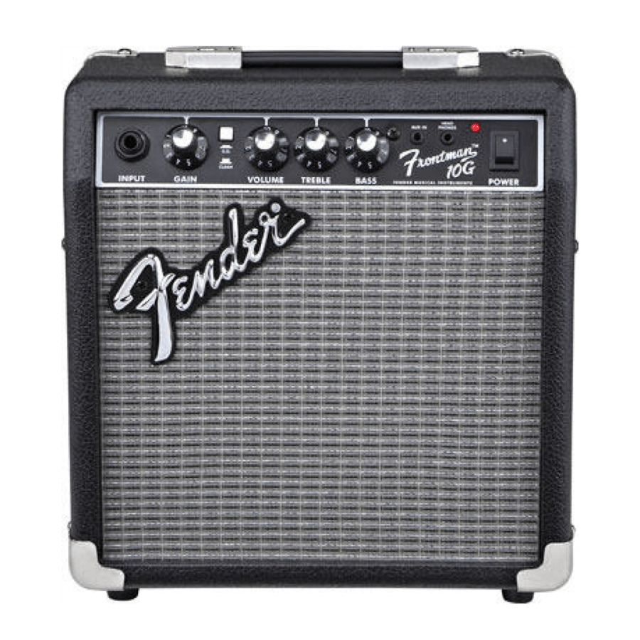 Frontman amps deliver quality tone at a great price, with custom-voiced built-in overdrive for great tone and the unmistakable Fender Blackface look. The 10-watt Frontman 10G features a 6” Special Design speaker and a adjustable gain control that rocks guitar tones from tube-emulated overdrive to full-strength ultra-saturated distortion - perfect for blues, metal and the famous Fender clean tone. Closed-back design gives a heavier bass response, 1/8” input lets you play along with media players, and 1/8” headphone output is great for silent practice.