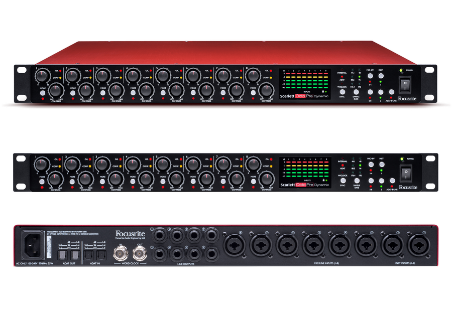 Building on the features of the Scarlett OctoPre, Scarlett OctoPre Dynamic brings you the ultimate Scarlett expansion with eight Scarlett mic preamps and analogue compression on every input channel providing a musical, soft-knee style of compression for more subtle control of your dynamics. The MORE button then allows you to double the ratio for more aggressive compression effects.