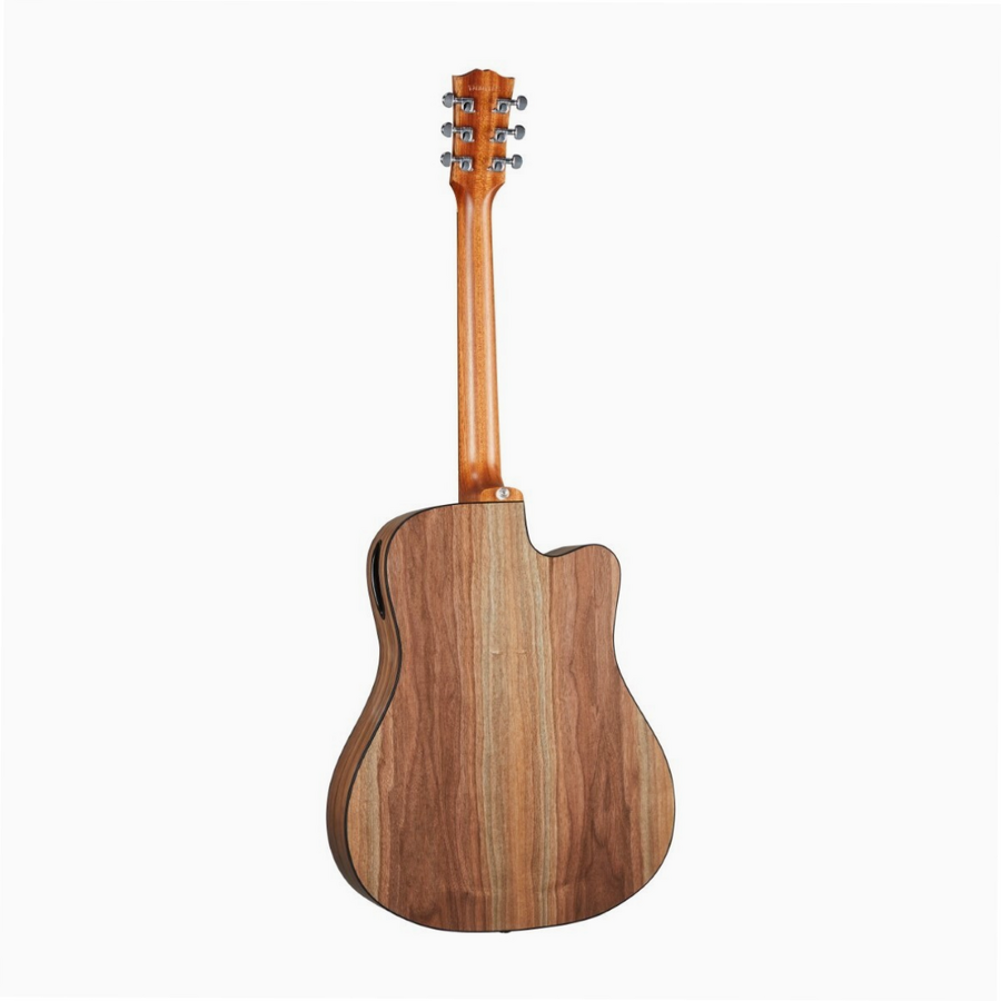 Modern design updates include a slimmer body thickness, for greater comfortability when both sitting and standing, as well as the Gibson Advanced Response neck profile, for increased comfortability and playability across the neck. The Gibson Player Port is also featured on the G-Writer, as a modern update to a design feature first conceptualised in the early '60s. The Player Port allows you to hear your acoustic the same way that the audience hears it, making for an immersive playing and listening experience. The G-Writer's tonewood pairing is perfect for the modern acoustic guitarist, with a solid Sitka Spruce top and solid Walnut back and sides, providing the G-Writer with plenty of twang, as well as bright, crisp highs, strong lows, and more present mids, which sit somewhere between that of Mahogany and Rosewood. The subtle nuances of these tonewoods aren't lost when plugging in the G-Writer, thanks to an LR Baggs Element Bronze pickup system. The G-Writer also features a Utile neck and striped Ebony fingerboard. Utile is an extremely durable and more sustainable alternative to Mahogany, exhibiting very similar tonal and playability characteristics. Striped Ebony is more sustainable than traditional Ebony, as it utilises the entire Ebony tree; it also makes for aesthetically pleasing and unique patterns.