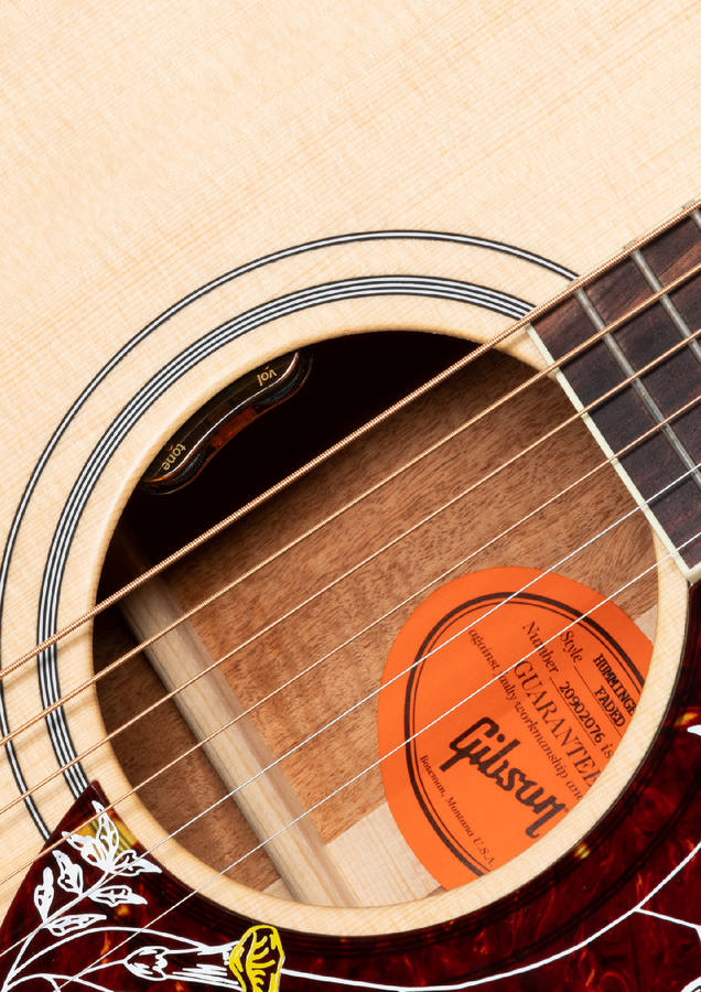 The unmistakable Gibson Hummingbird is followed by the masses as one of the most remarkable acoustic guitars ever built. The new Hummingbird Faded blends vintage appointments and today's modern, high-quality build construction. The Hummingbird Faded is outfitted with gold Gotoh Keystone tuners, a traditional Hummingbird truss rod cover, and a bone nut and saddle. The built-in LR Baggs VTC electronics make this guitar stage and studio-ready, right out of the included hardshell case.