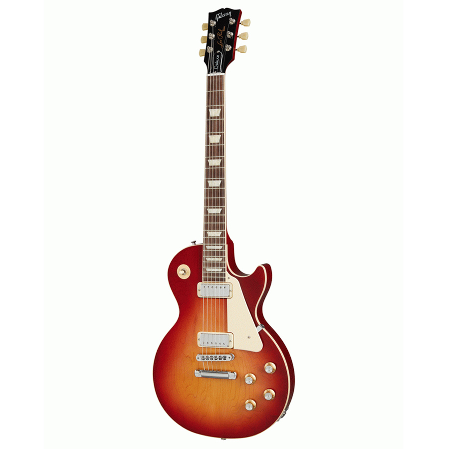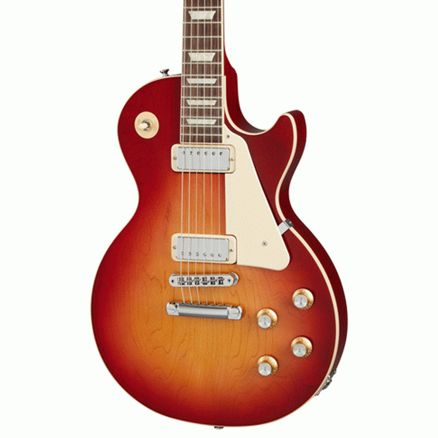 First released in 1969, the Deluxe saw the introduction of the mini humbucker to the Les Paul lineup. Mini humbuckers retain the hum-free performance of their full-sized cousins but with a somewhat clearer and brighter tonality. The new Deluxe has features that were inspired by those early models from the 1970s, with a non-weight relief mahogany body and bound maple top, a bound mahogany neck with a Rounded C profile, vintage-style Keystone tuners, Graph Tech nut, and a traditional Les Paul control layout with 2 Volume and 2 Tone controls wired with Orange Drop capacitors. Available in classic Goldtop and 70s Cherry Sunburst gloss nitrocellulose lacquer finishes.
