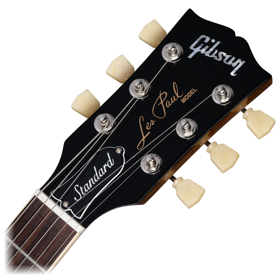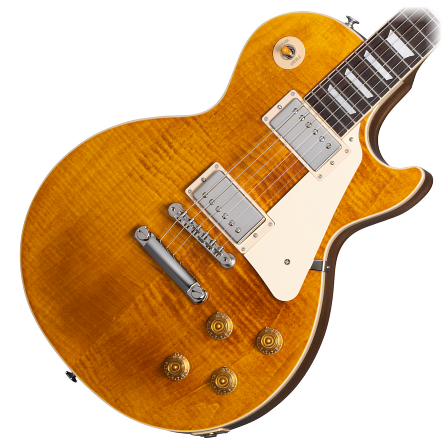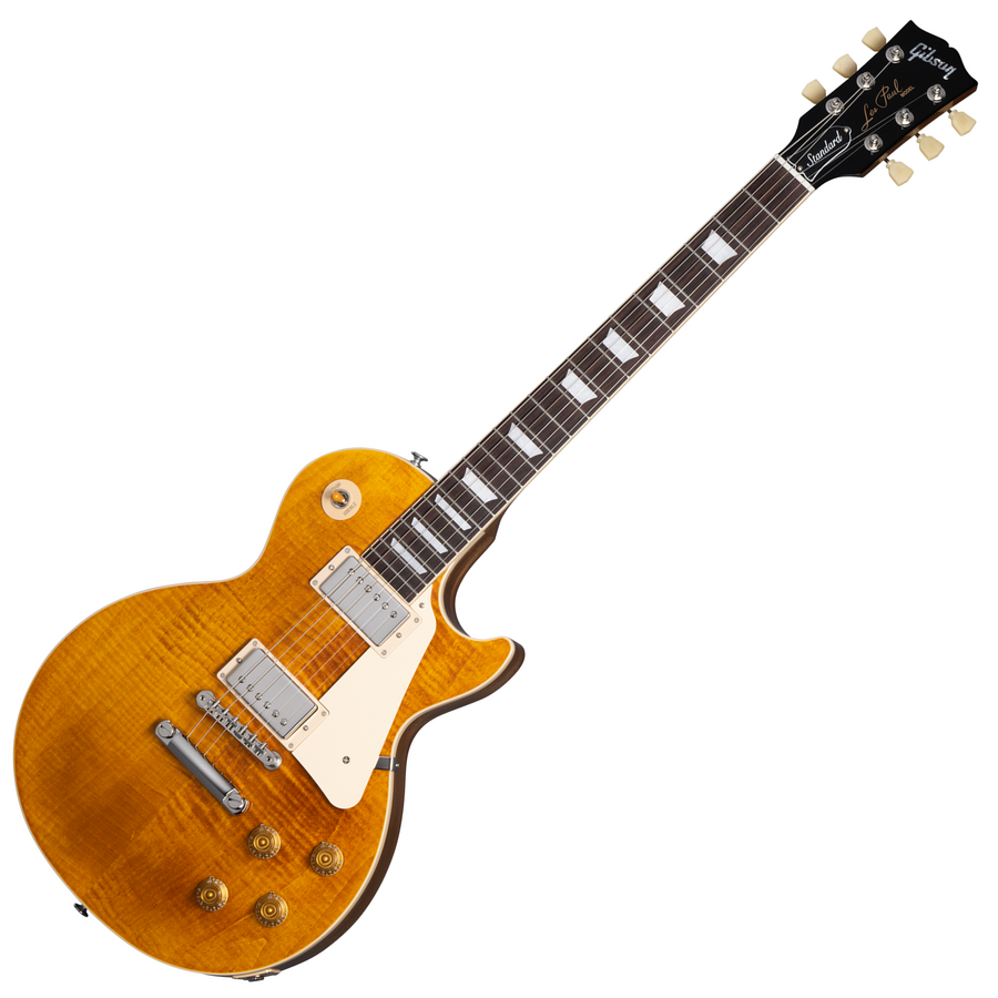 The new Les Paul 50's Standard returns to the famed classic design. It pays tribute to Gibson's Golden Era of innovation and brings authenticity back to life. The Les Paul Standard 50s P-90 has a solid mahogany body with a maple top and a rounded 50s-style mahogany neck with a rosewood fingerboard and trapezoid inlays. It's equipped with an ABR-1, the classic-style Tune-O-Matic™ bridge, an aluminium Stop Bar tailpiece, Vintage Deluxe tuners with Keystone buttons, and Top Hat knobs. The classic P-90 pickups (neck and bridge) are loaded with Alnico 5 magnets, audio taper potentiometers, and Orange Drop® capacitors.