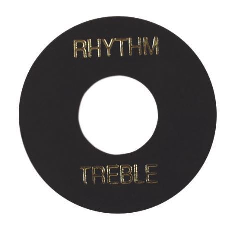 An exact replacement for worn out toggle switch washers, securely fitting over the switch shaft and held in place by the nut. This OEM part is made from ABS plastic with the gold imprinted letters “RHYTHM” and “TREBLE.”