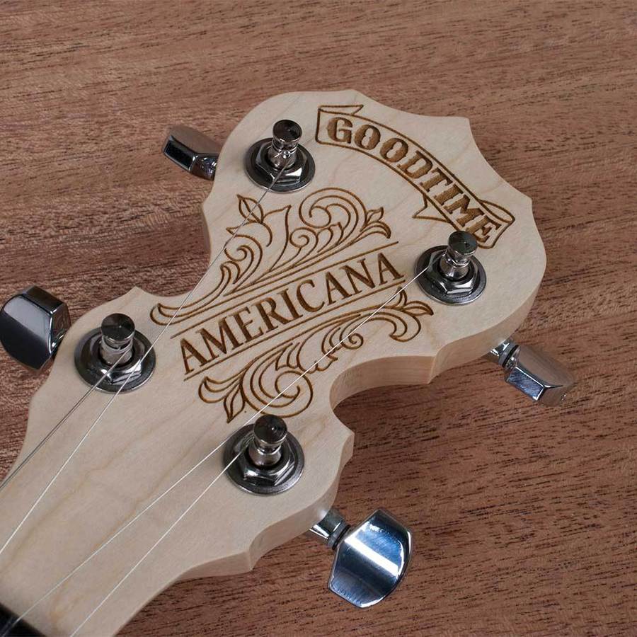 The Americanaª is the first 5-string banjo from Deering to be fitted with their new Grand 12Ó rim, which gives the banjo a stronger bass response and a much warmer tone. The fullness and warmth of the larger rim is further enhanced by the addition of a 12Ó Renaissance head which beautifully complements the banjo both visually and sonically. Made in America. Continuing the long standing Goodtime philosophy of offering the best value American made banjos available, the Americana is the lowest priced 12Ó model on the market today and retains the distinctive natural blonde Goodtime aesthetics. In keeping with the rest of the Goodtime line, this banjo also features guitar style tuners, a rock maple neck, nickel plated hardware, and hardwood inlays Played with an old time style technique, the Americana is reminiscent of banjos from a period when larger rims were more prevalent which makes the 12Ó a great setup for playing old time music. A traditional 11Ó banjo with a frosted top head has a far brighter sound and will ÒcutÓ more. Since the combination of the Grand 12Ó rim and the Renaissance head makes for a wonderfully laid back sound in comparison, the Americana lends itself perfectly for musicians looking to use the banjo to back up a vocalist or another instrument, instead of playing the a lead instrument role. Take a walk on the wide side with the new Goodtime Americanaª banjo.