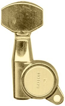 Set of 6 deluxe gold plated machine heads with diecast housing. Small buttons. 6-in-line. 16 to 1 gear ratio.