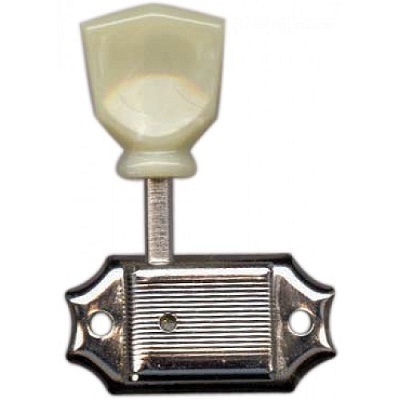 Set of 6, deluxe nickel machine heads, pearloid tulip style buttons. Vintage series. 3-a-side. 15 to 1 gear ratio. Press-fit bushings.