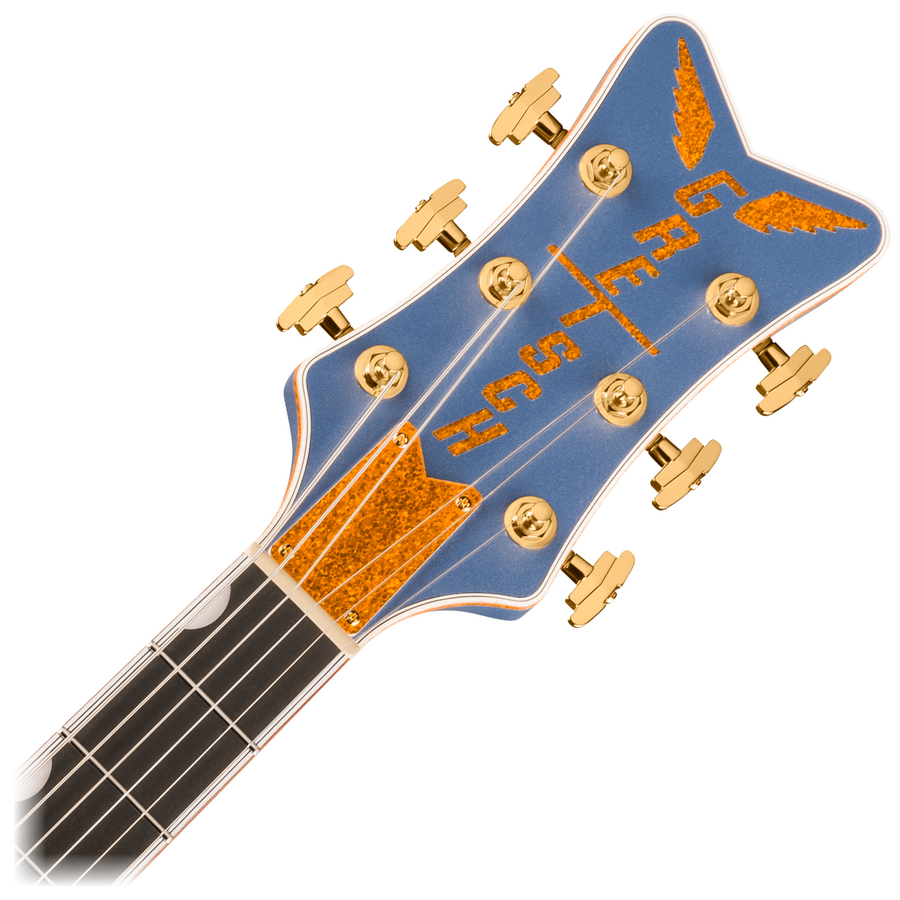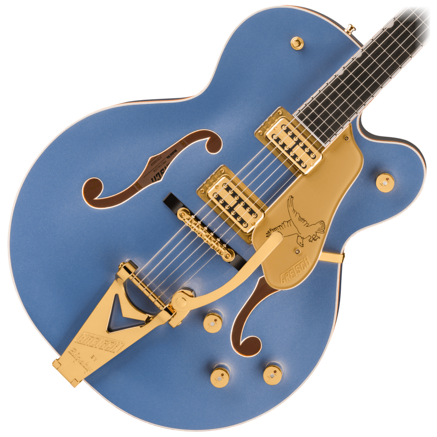 Hardware Bridge: Adjusto-Matic Bridge Cover/Tailpiece: Bigsby B6 String-Thru Bridge Mounting: Pinned Pickguard: Gold Plexi with Gold Gretsch® Logo and Black Falcon™ Graphic Pickup Covers: Gold Control Knobs: G-Arrow Switch Tip: Gold Hardware Finish: Gold Tuning Machines: Grover Imperial Locking Strings: Nickel Plated Steel (.011-.049 Gauges) Strap Buttons: Grover Strap Locks