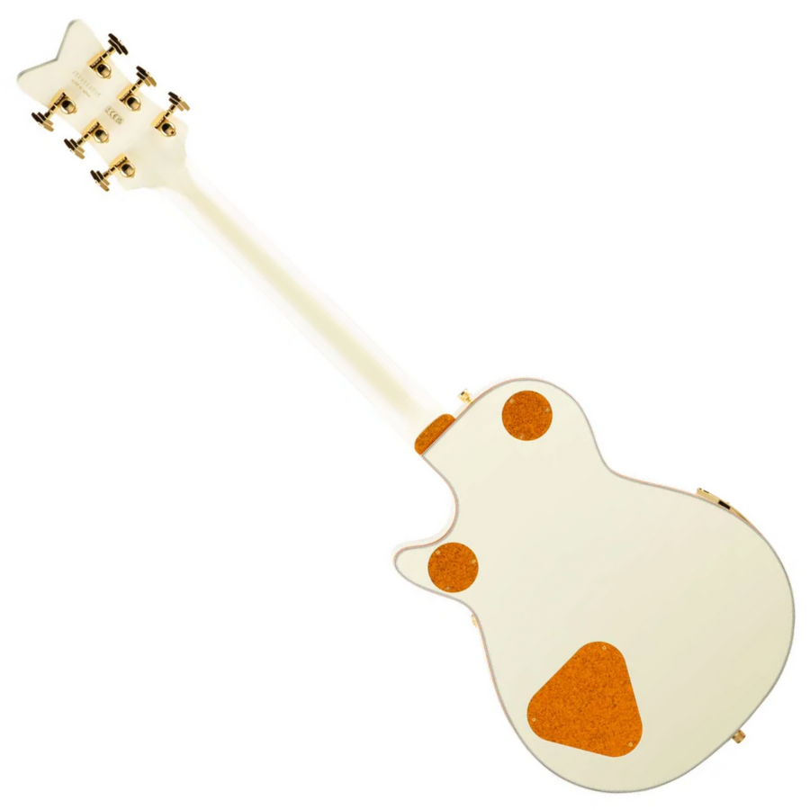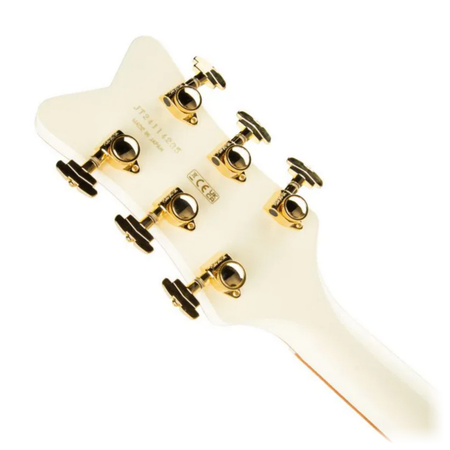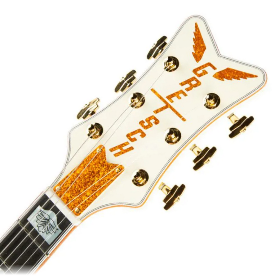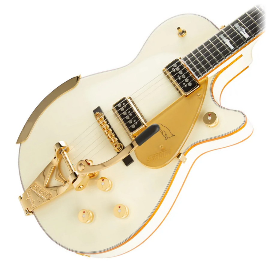 Features Body Material: Mahogany Body Finish: Gloss Nitrocellulose Lacquer Neck: Maple, Standard U Neck Finish: Gloss Fingerboard: Ebony, 12” (305 mm) Frets: 22, Medium Position Inlays: Mother of Pearl Humpblock with Feather Engraving Nut (Material/Width): Bone, 43 mm Tuning Machines: Grover Imperial Locking Gold Scale Length: 24.6” (625 mm) Bridge: Adjusto-Matic™, Gold Tailpiece: Cadillac, Gold Pickguard: Gold Plexi w/Gold GRETSCH Logo & Black Penguin Graphic Pickups: TV Jones T-Armond (Bridge), (Middle), TV Jones T-Armond (Neck) Pickup Switching: 3-Position Toggle: 3-Position Toggle: Position 1. Bridge Pickup, Position 2. Bridge and Neck Pickups, Position 3. Neck Pickup Controls: Volume 1. (Neck Pickup), Volume 2. (Bridge Pickup), Master Volume, Master Tone Control Knobs: Arrow Jewel Gold