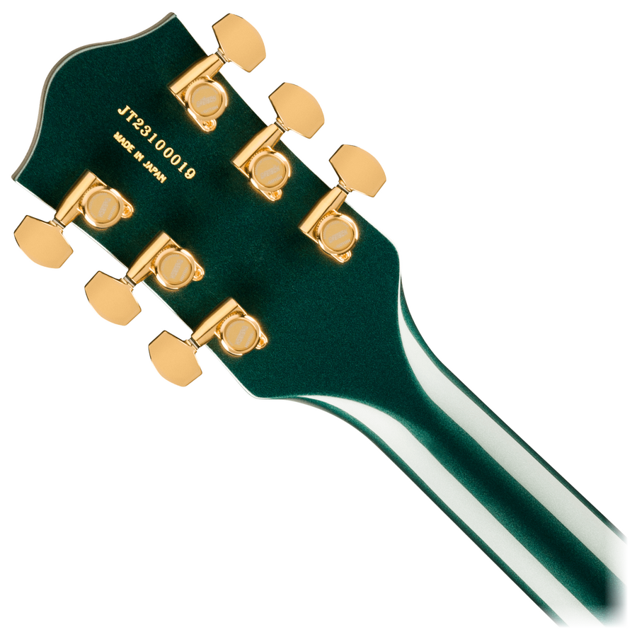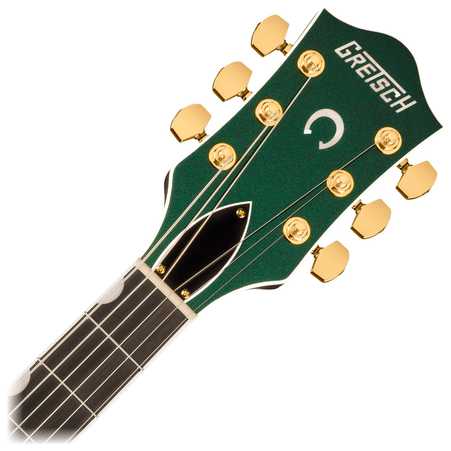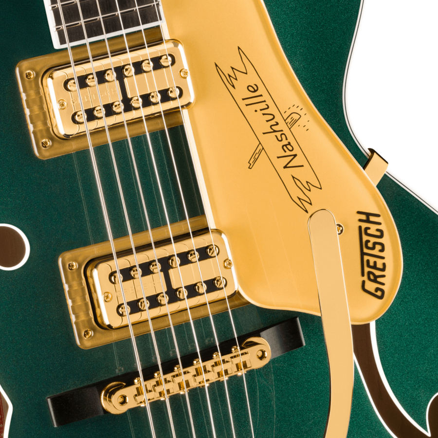 Hardware Bridge: Adjusto-Matic Bridge Cover/Tailpiece: Bigsby B6GP String-Thru Bridge Mounting: Pinned Pickguard: Gold Plexi with Black Gretsch Logo and Nashville Post Sign Pickup Covers: Gold Control Knobs: G-Arrow Switch Tip: Gold Hardware Finish: Gold Tuning Machines: Gotoh Locking Strings: Nickel Plated Steel (.011-.049 Gauges) Strap Buttons: Grover Strap Locks