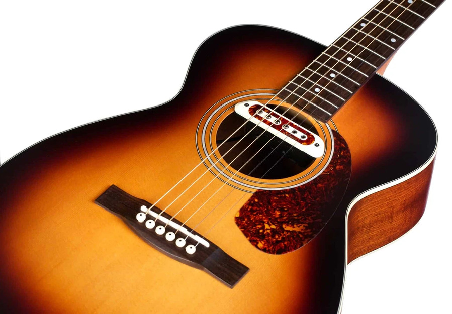 Meet the M-240E Troubadour, a small-body, sunburst addition to Guild’s acoustic archback line.