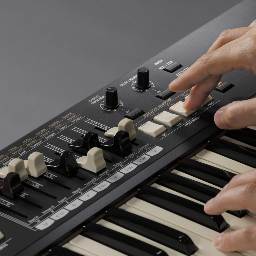 There are three period-accurate models of the most popular transistor “Combo Organs” aboard, able to be registered in the same manner as the originals. Rounding out the Spec are a 70’s-type String ensemble, and an analog-style polysynth with twin oscillators. The drawbars serve as controls for these special voices. The M-solo is available in Matte Black, Matte Blue, and Matte Burgundy finishes.