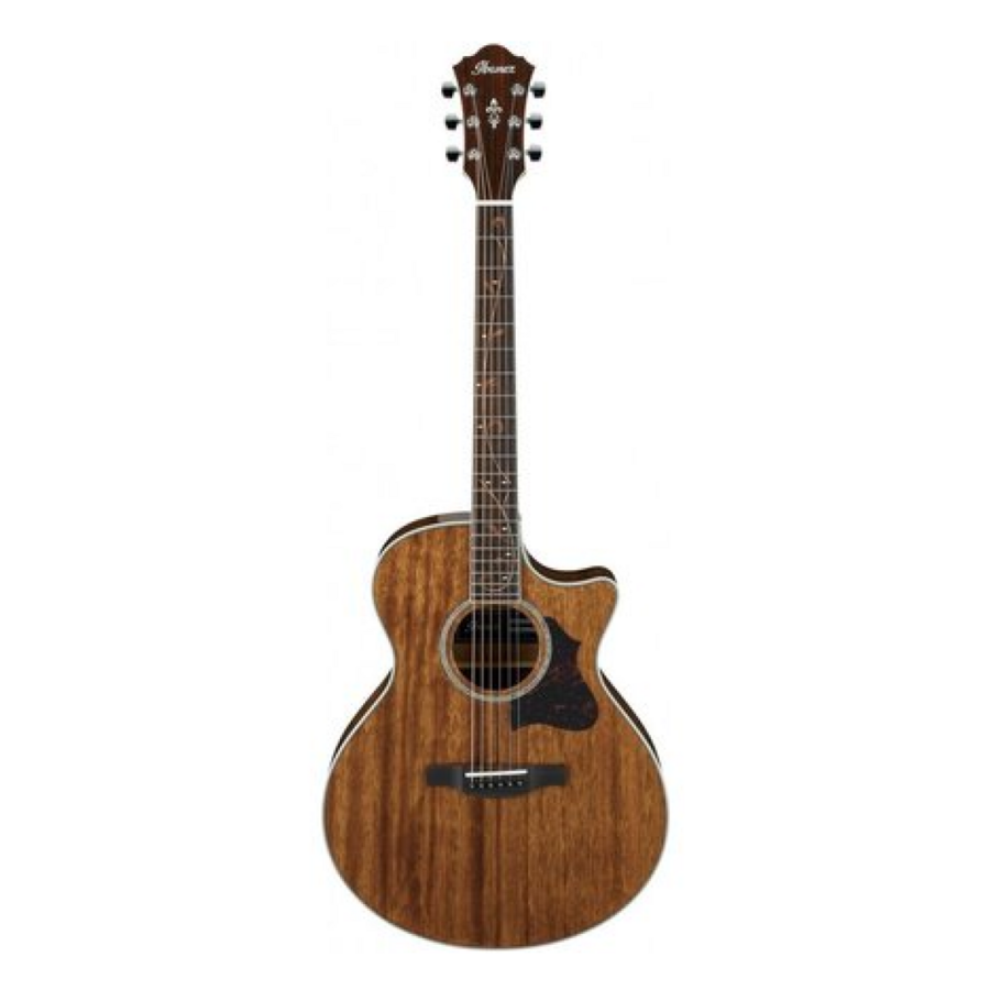 The AE body shape features contemporary design elements to achieve high playability and create a well-balanced sound that adheres to the concept of the AE series. The combination of the specially designed Scalloped X Bracing and Tone Projection Back Bracing produces a versatile sound character. A rich sustain is provided, which works for both finger and plectrum playing. The all-Mahogany body of the AE245 generates a woody, warm tone with a soft response when finger picking and provides punchy high-mids with a clear projection when strumming. The fretboard inlay has a delicate but dynamic design. The wooden inlays give a sophisticated feel to the guitar. The compact, onboard active preamp simply features a mute switch to eliminate unexpected parameter changes during performances. This helps reduce the guitars size and weight, minimize body contact, and maximize the acoustic tone. The newly designed under-the-saddle pickup equalizes the volume of each string and delivers a well-balanced signal. The natural acoustic tone from this active circuit is remarkably stable and resists noise. It will support performances on stage, from solos to ensembles. AE body Solid Mahogany top Mahogany back & sides Body depth: 100/115mm at neck joint/body end Mahogany neck (satin finish) Rosewood bridge & fretboard 44mm width nut Specially designed Wooden fretboard inlay Abalone & Maple rosette Bone nut & 4mm Bone Saddle Chrome Die-cast tuners (18:1 gear ratio) Ibanez T-bar undersaddle pickup Ibanez Custom Electronics Ibanez Advantage bridge pins D'Addario EXP strings Ibanez Original Scalloped X bracing Ibanez Original Tone Projection Back Bracing